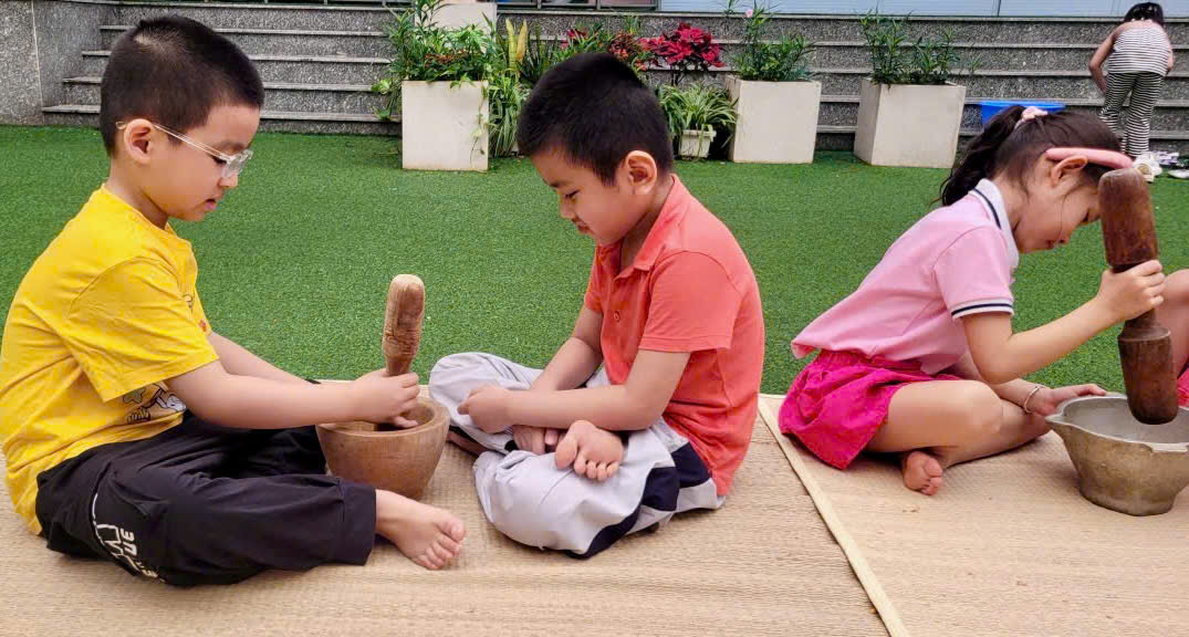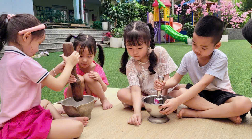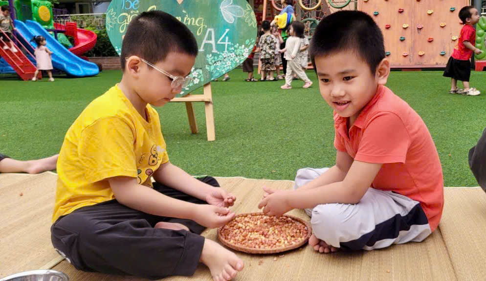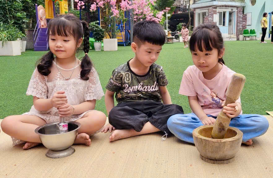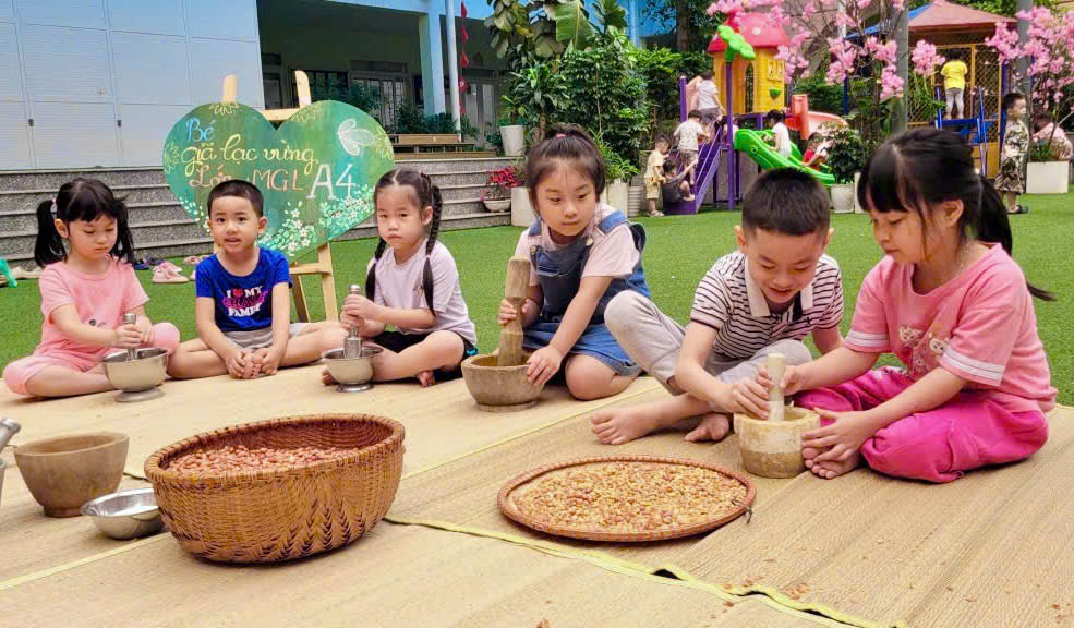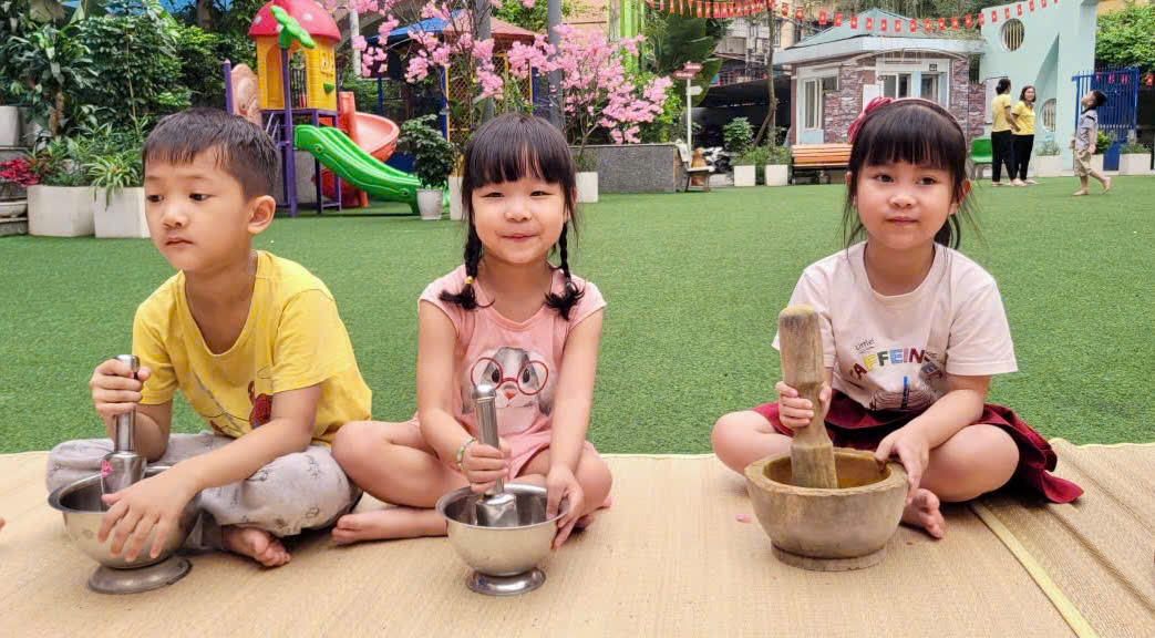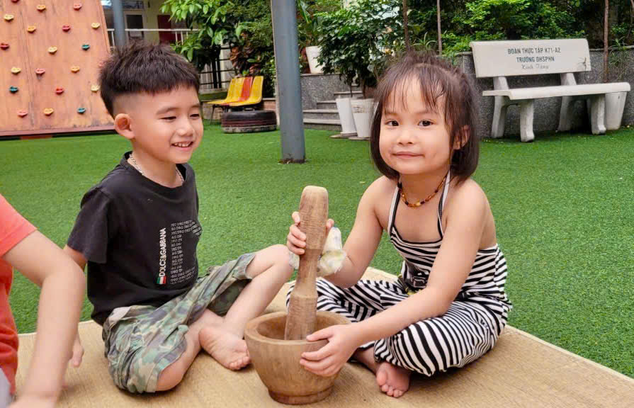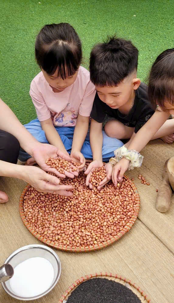 Khoảnh khắc đáng yêu nhất là khi các con cúi sát vào cối, chăm chú nhìn từng hạt lạc, hạt vừng được giã nhỏ, rồi reo lên thích thú khi mùi thơm lan tỏa. Những đôi tay nhỏ xinh thoăn thoắt làm việc, những khuôn mặt rạng rỡ niềm vui – tất cả đã tạo nên một bức tranh thật sống động và ấm áp.
