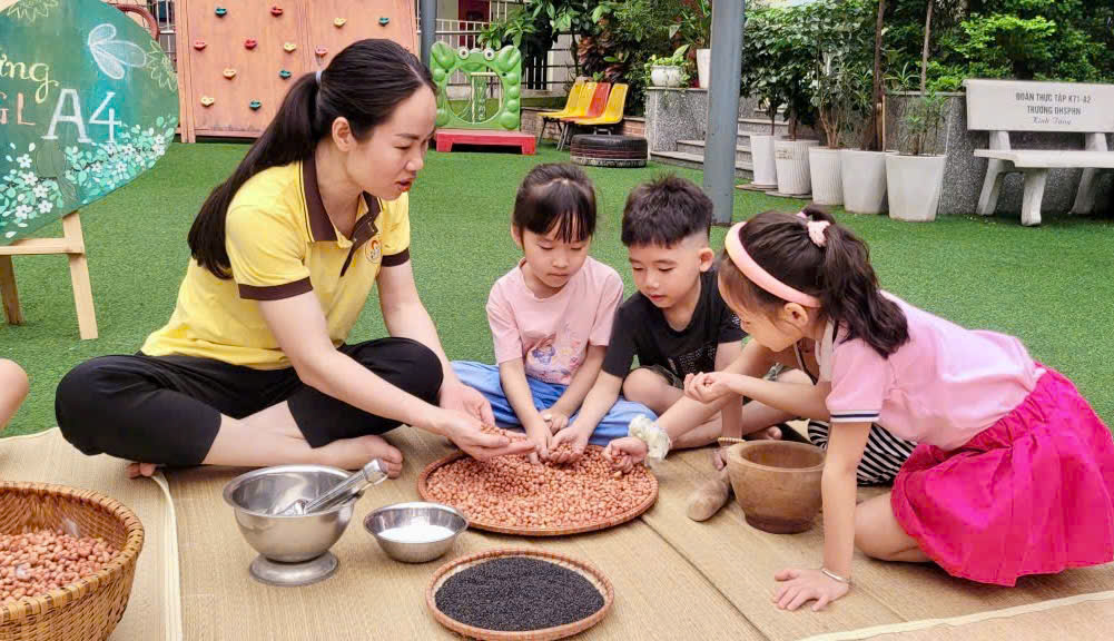 Trước khi thực hành, các con được cô giới thiệu và trực tiếp quan sát những nguyên liệu quen thuộc: lạc rang thơm bùi, vừng rang đen nhánh và muối trắng tinh. Không chỉ dừng lại ở việc nhận biết, các con còn được tìm hiểu về giá trị dinh dưỡng của từng loại – biết rằng hạt lạc giúp cơ thể khỏe mạnh, hạt vừng tốt cho xương và làn da… Những kiến thức nhỏ bé ấy được tiếp nhận một cách tự nhiên qua sự tò mò, thích thú của trẻ.
