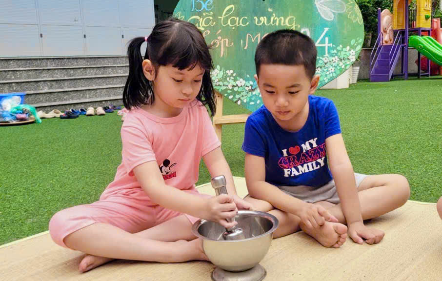 Ngay từ đầu giờ, không khí lớp học đã rộn ràng hơn thường lệ. Nhờ sự chuẩn bị chu đáo của bố mẹ, mỗi bạn nhỏ đều mang theo cối và chày xinh xắn đến lớp. Bạn nào cũng háo hức khoe “đồ nghề” của mình, ánh mắt lấp lánh niềm vui và mong chờ được bắt tay vào buổi trải nghiệm.