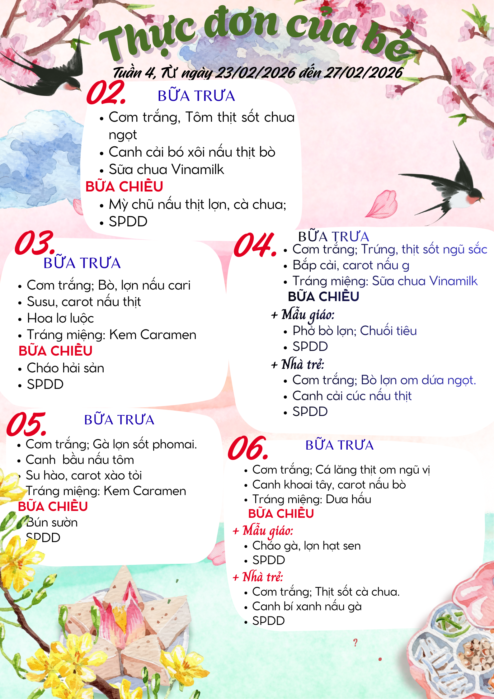 Thực đơn tuần 4 (từ ngày 23/02 đến 27/02/2026) của các bé trường Mầm non Họa Mi