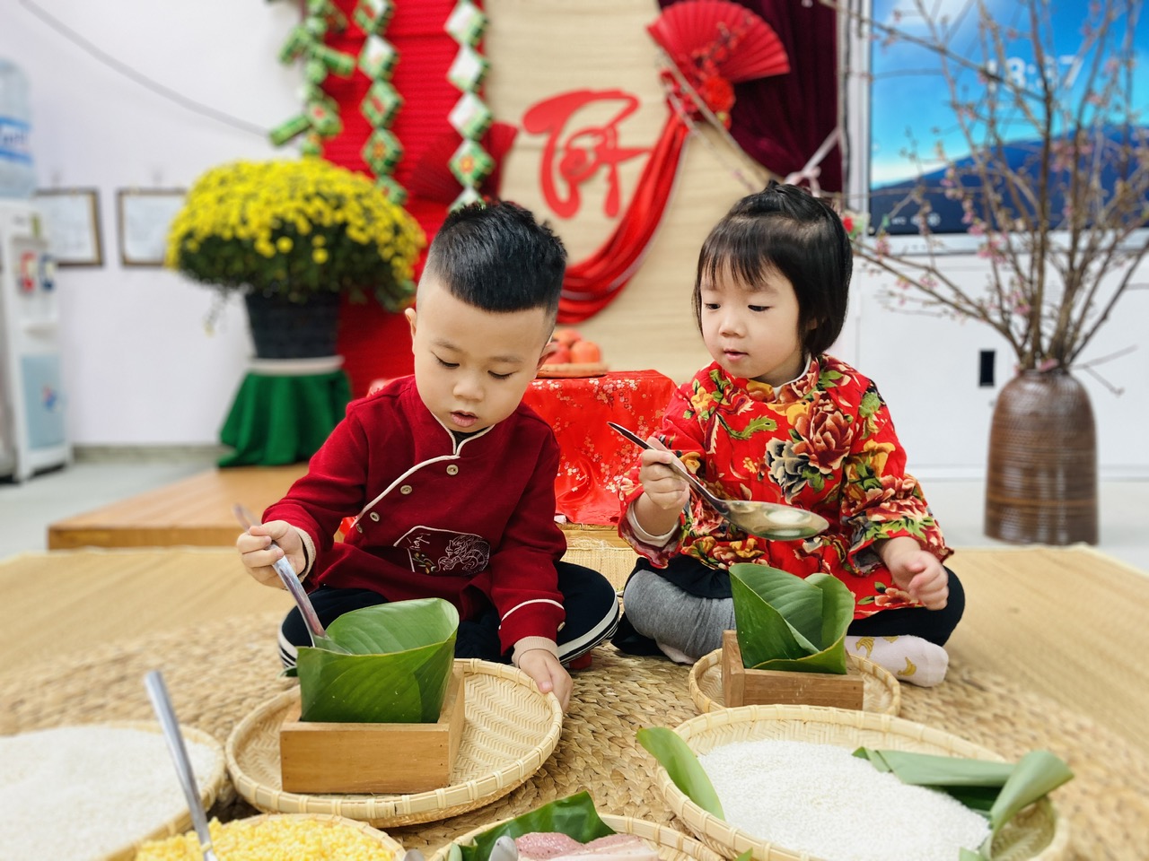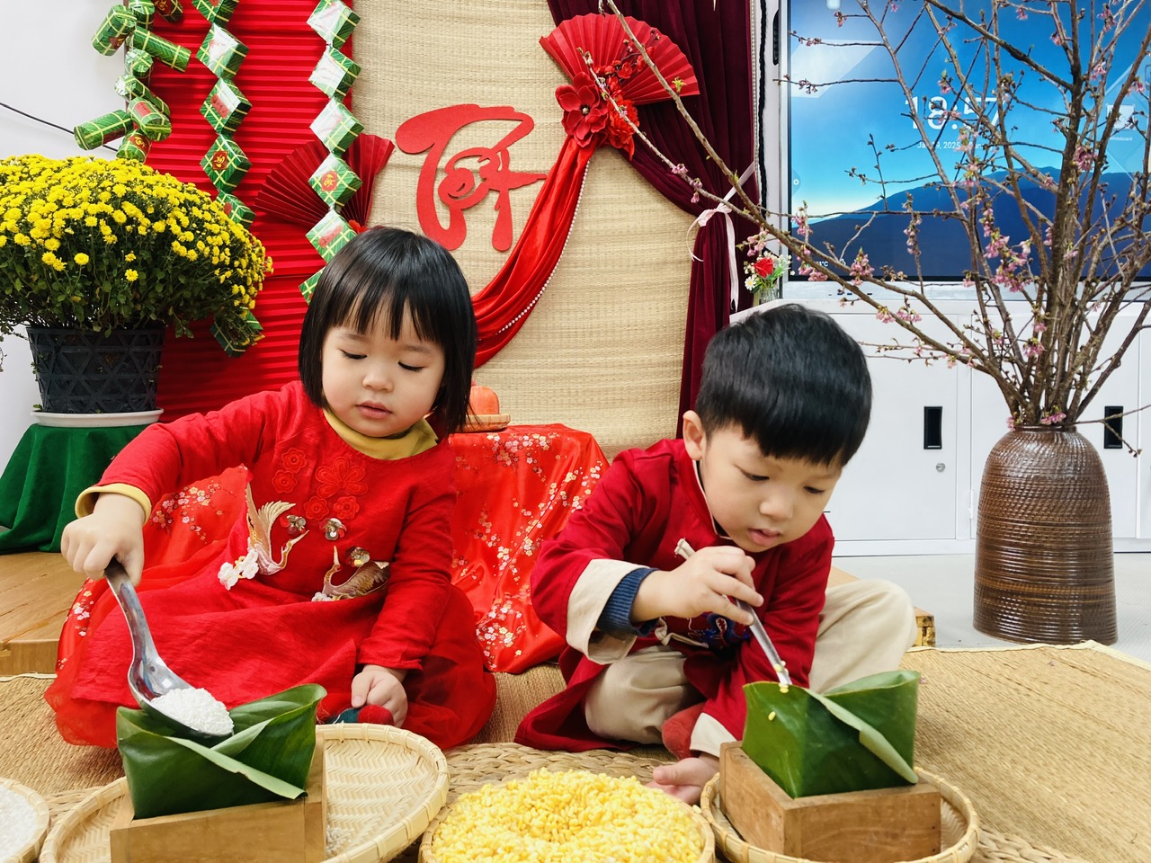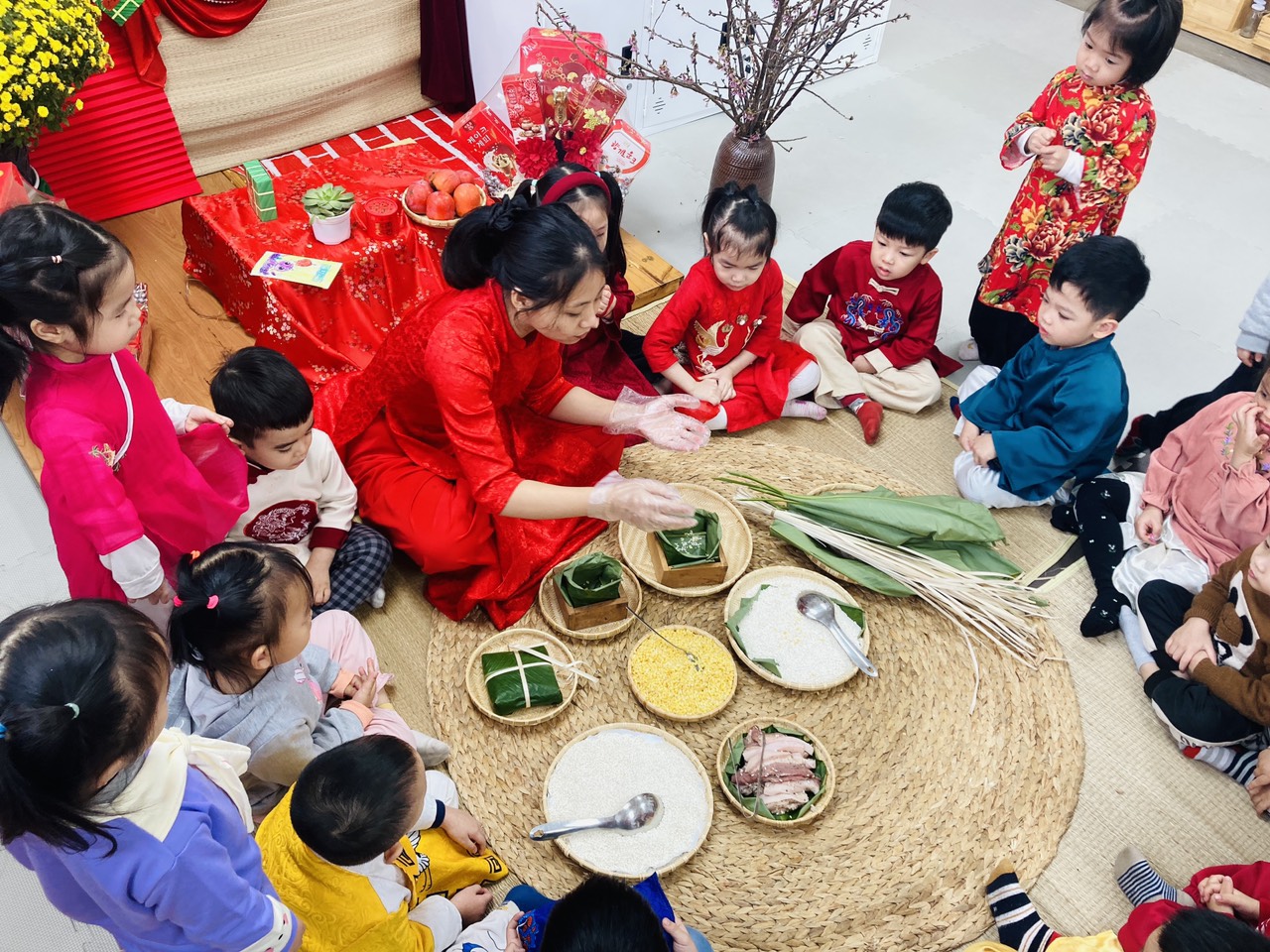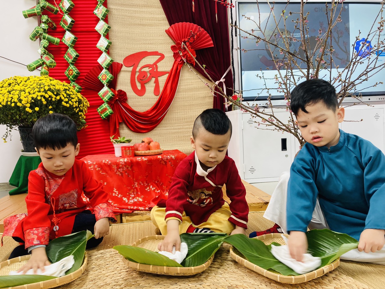 Với những nguyên liệu thân thuộc nhưng mang đậm nét đặc trưng của ngày Tết như: lá dong, gạo nếp, đỗ xanh, hạt tiêu ướp thịt… cùng với những tiếng cười đùa vui vẻ, những bàn tay nhỏ xinh và biết bao niềm háo hức của các con chúng ta đã có một trải nghiệm thật vui vẻ với hoạt động “Gói bánh chưng ngày Tết” đúng không nào?