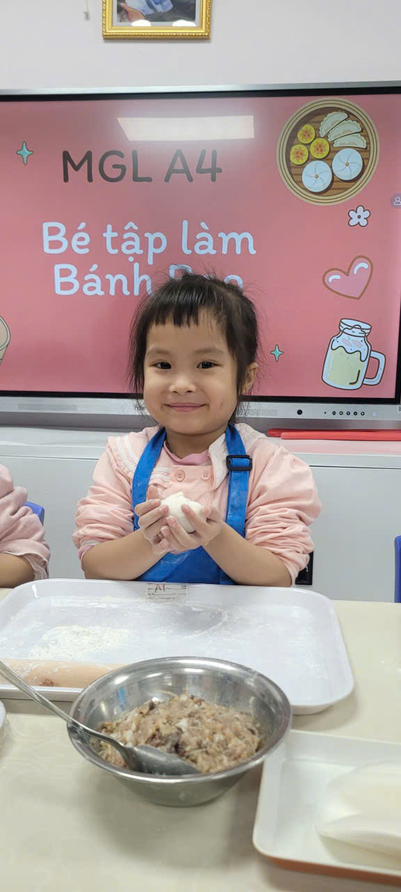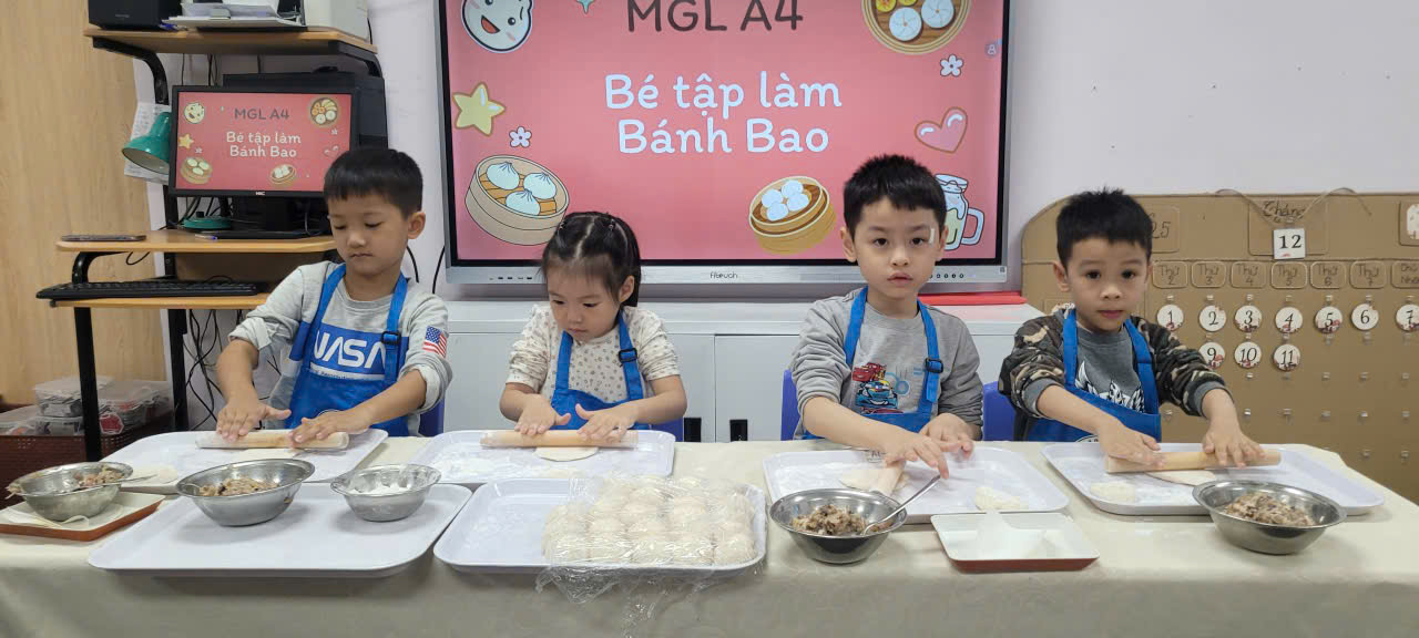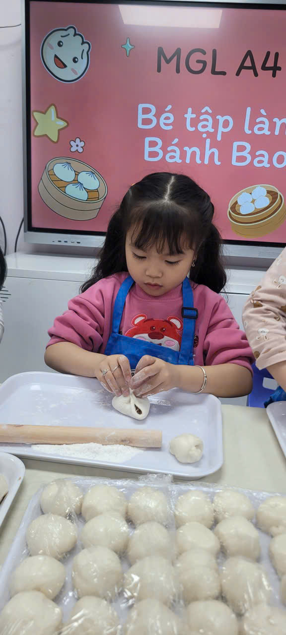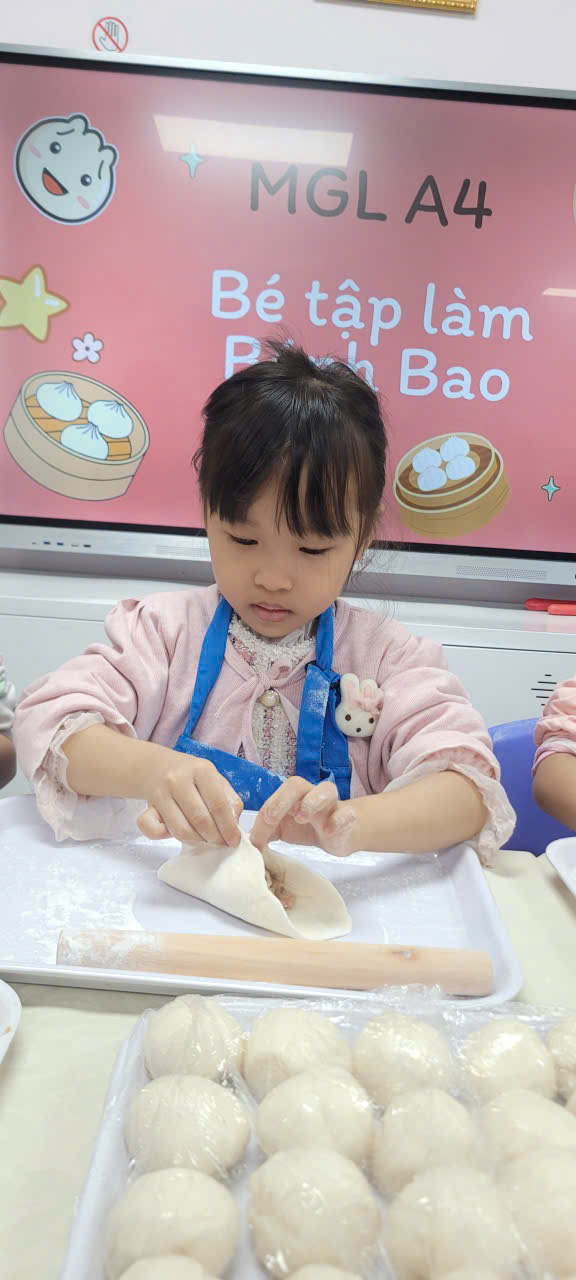 Trong không khí học tập sôi nổi và tràn đầy hứng khởi, các bạn nhỏ lớp MGL A4 đã có một buổi trải nghiệm vô cùng thú vị với hoạt động làm bánh bao truyền thống – một món ăn quen thuộc, gần gũi trong bữa ăn gia đình Việt.