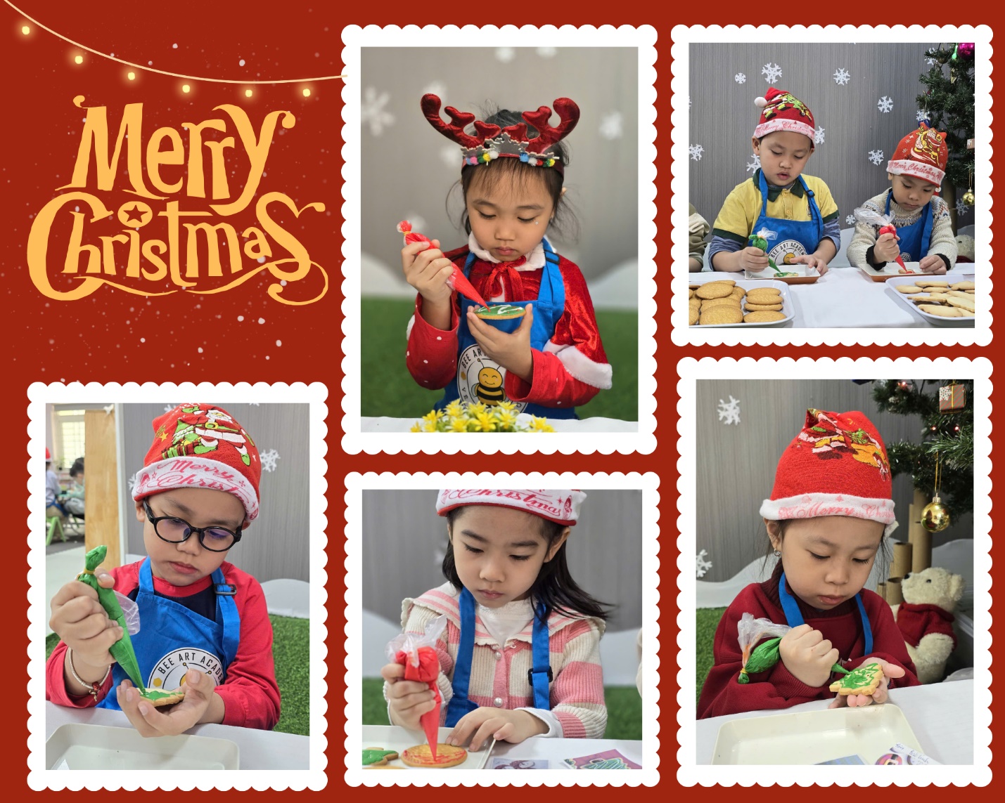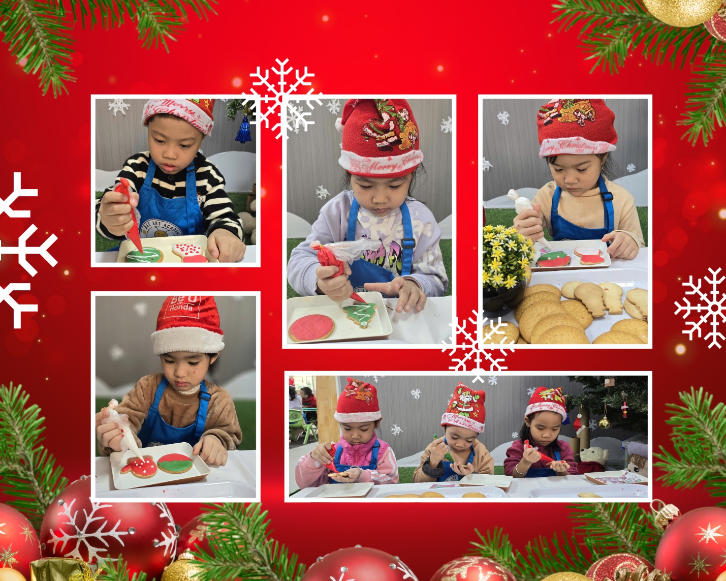 Một hoạt động đặc biệt trong ngày lễ là phần trang trí bánh Noel. Mỗi bé được nhận một chiếc bánh nhỏ cùng với các nguyên liệu trang trí như đường màu để vẽ. Dưới sự hướng dẫn của các cô giáo, các bé tha hồ sáng tạo, tự tay trang trí chiếc bánh của riêng mình. Những chiếc bánh không chỉ đẹp mắt mà còn thể hiện sự khéo léo và trí tưởng tượng phong phú của các bé. Hoạt động này không chỉ mang lại niềm vui mà còn giúp các bé rèn luyện sự tỉ mỉ và tinh thần làm việc nhóm.