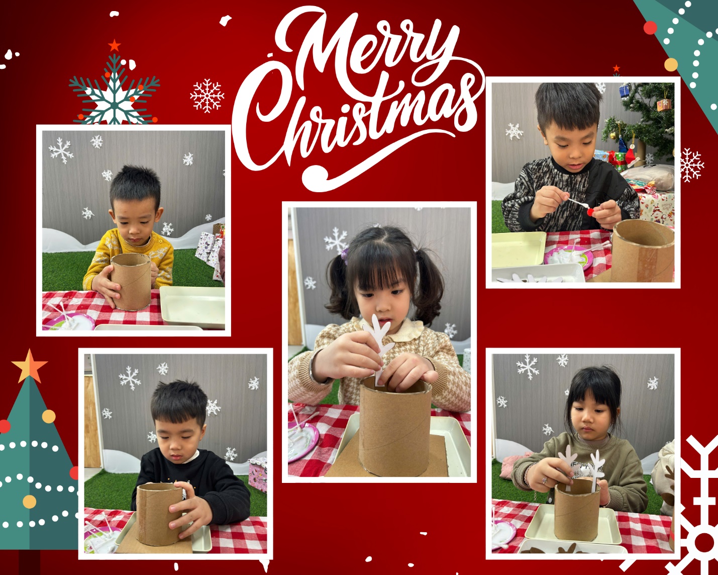 Một hoạt động sáng tạo khác được các bé yêu thích là làm hộp bút tuần lộc. Với nguyên liệu đơn giản như ống giấy, giấy màu, keo dán, và các quả bông nhỏ, các bé đã tự tay tạo ra những chiếc hộp bút ngộ nghĩnh. Các cô giáo hướng dẫn từng bước, từ việc cắt dán đến việc trang trí hộp bút hình tuần lộc với những chi tiết đáng yêu như đôi sừng, chiếc mũi đỏ và đôi mắt tròn xoe. Hoạt động này không chỉ giúp các bé rèn luyện kỹ năng thủ công mà còn khuyến khích tinh thần sáng tạo và sự kiên nhẫn.