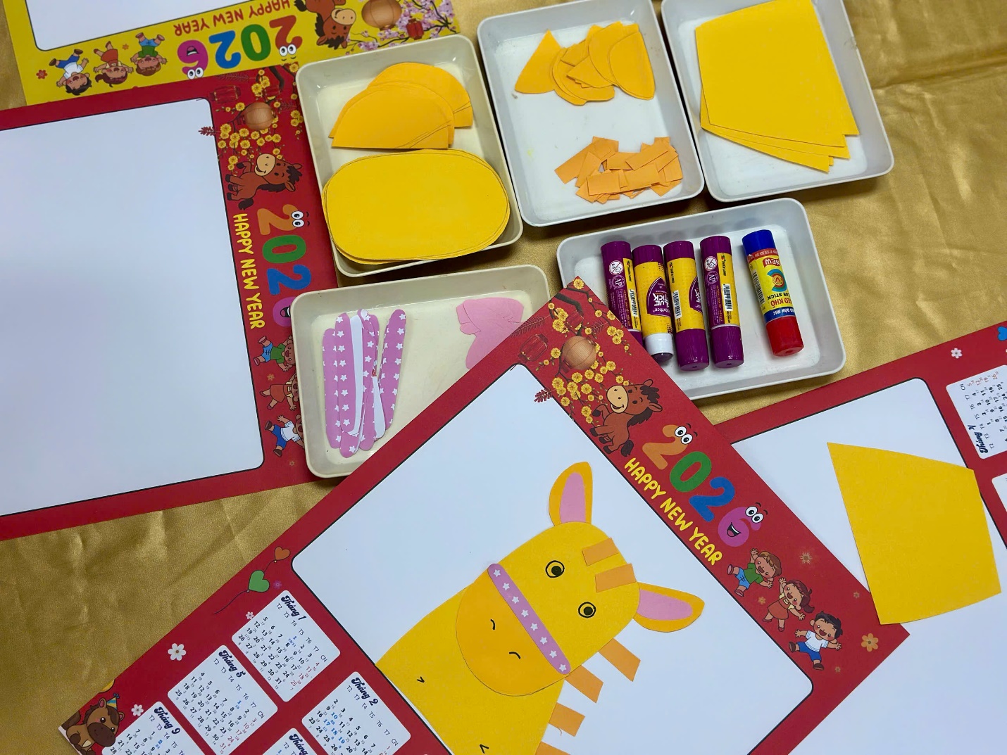 Ở trung tâm tờ lịch, mỗi bé được dán hình một chú ngựa vàng rực rỡ – biểu tượng của may mắn, sức mạnh, thành công và tinh thần bền bỉ vươn lên. Những đôi bàn tay nhỏ xíu tỉ mỉ bóc dán, căn chỉnh sao cho chú ngựa thật ngay ngắn, thật đẹp trên trang lịch của mình. Gương mặt bạn nào cũng ánh lên niềm tự hào khi hoàn thành bước đầu tiên.