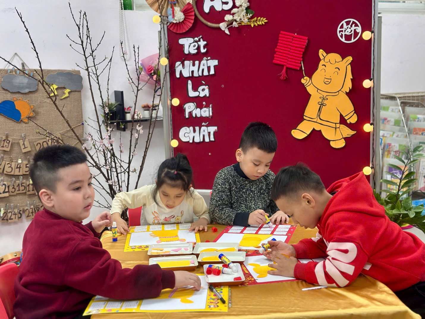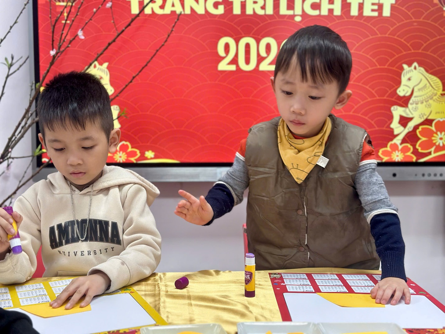 Dưới sự hướng dẫn nhẹ nhàng của cô giáo, các bé được làm quen với ý nghĩa của lịch Tết – không chỉ là vật dụng để xem ngày tháng mà còn là món quà chứa đựng lời chúc tốt đẹp cho năm mới.