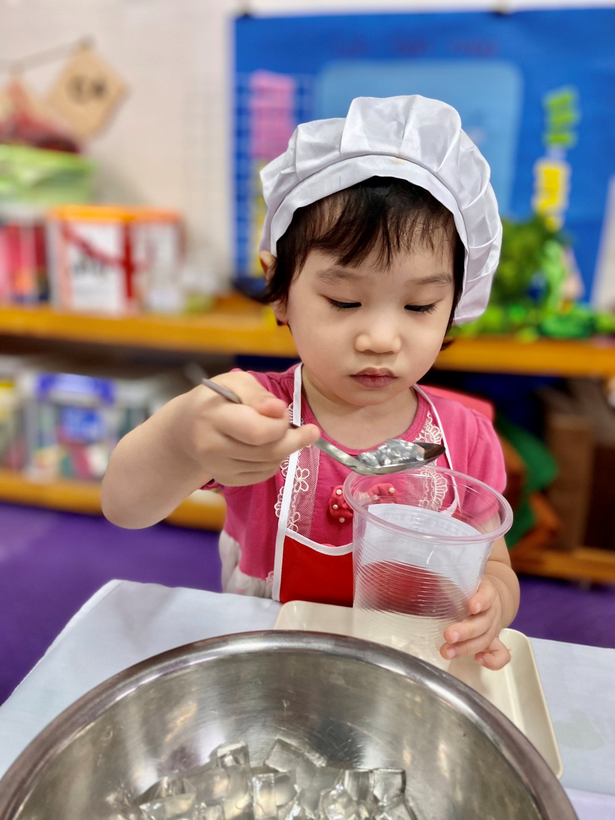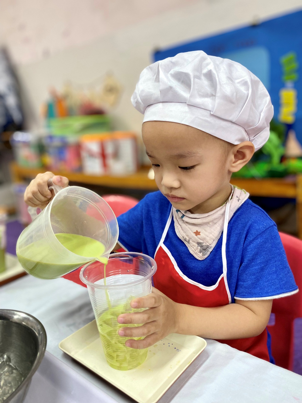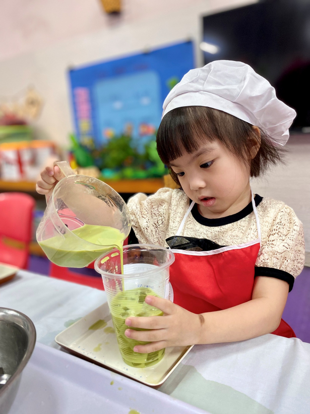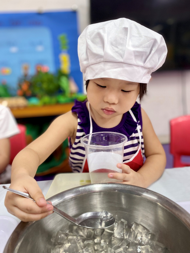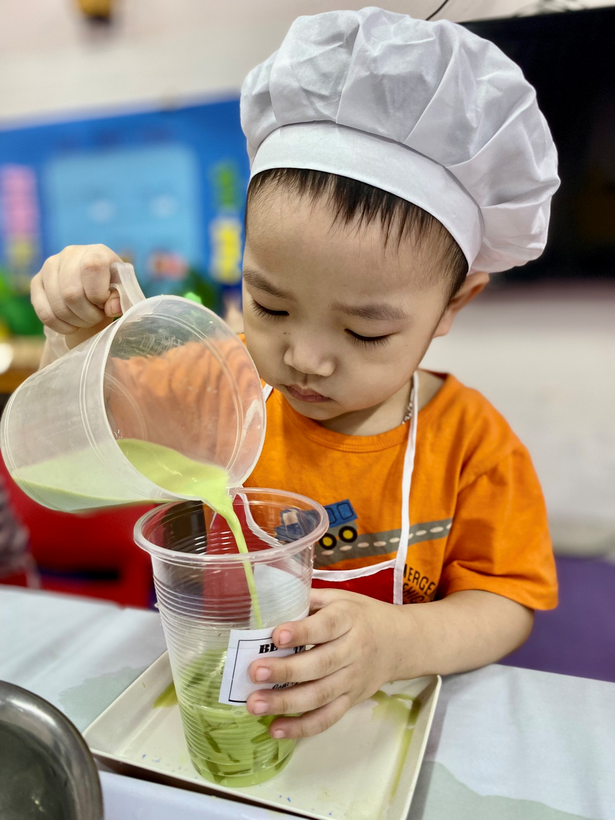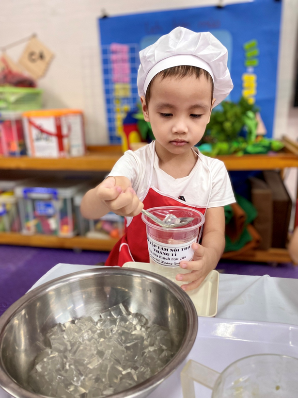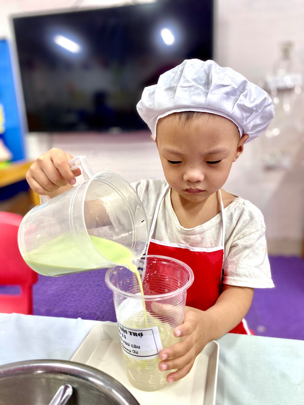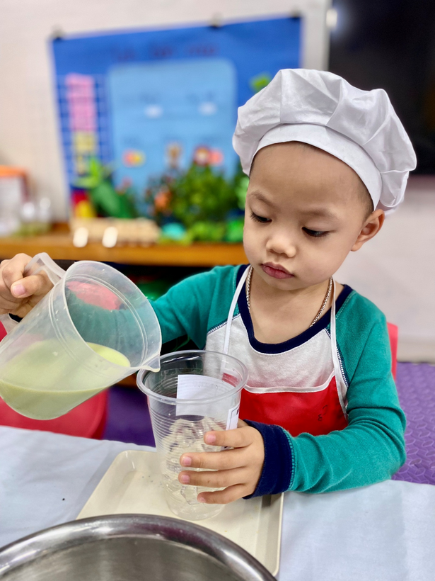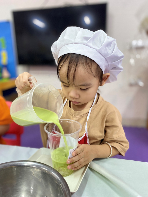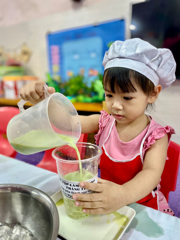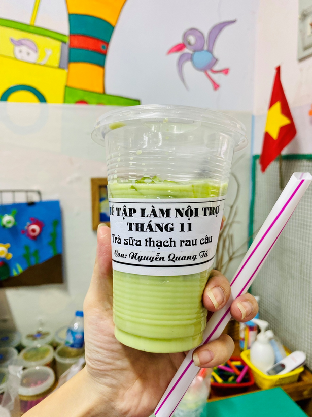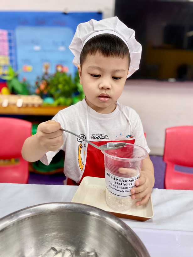 Đối với hoạt động “Bé tập làm nội trợ” ở trường mầm non, các bé đã khá quen khi được thực hiện từ những tháng đầu tiên vào học. Bé được cùng các bạn làm các món ăn, đồ uống quen thuộc, gần gũi và dễ làm như: Bánh mì kẹp, làm bánh. Tháng 11 này, các con lại tiếp tục được giáo viên lớp cho thực hiện món đồ uống “Trà xanh sữa” cực ngon, bổ dưỡng mà lại vô cùng dễ làm. Trẻ được tự xúc thạch, tự rót trà vào ly. Khi rót trà cũng phải thật khéo léo nhé: 1 tay cầm cốc, 1 tay cầm bình, rót từ từ vào cốc mà không làm tràn ra ngoài khiến trẻ tự học cách ước lượng và biết lấy các nguyên liệu sao cho phù hợp.