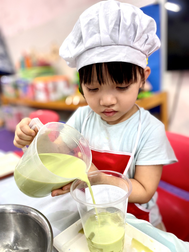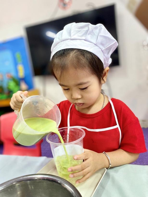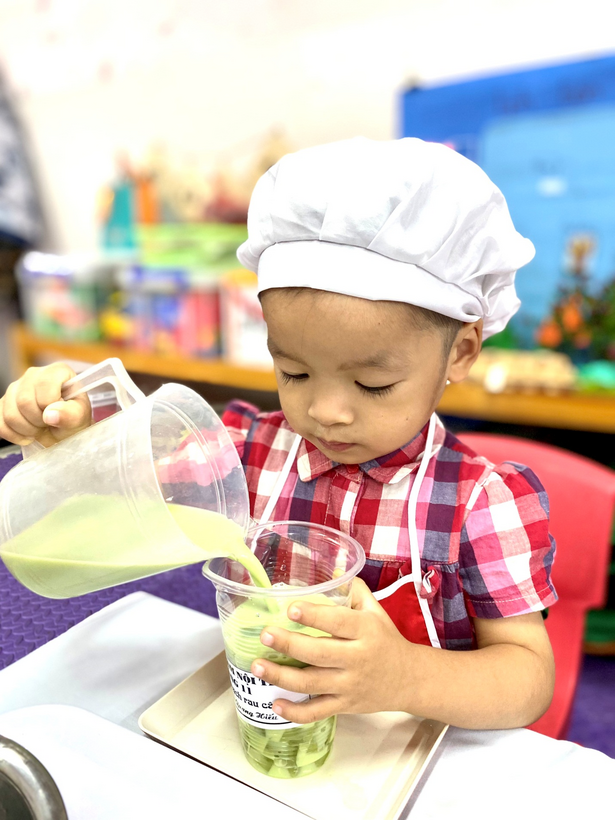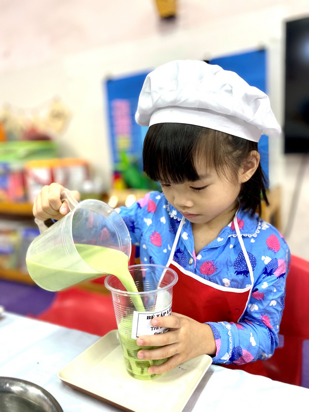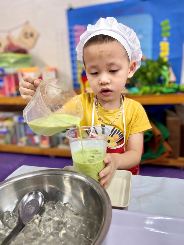 Thành quả của trẻ là món Trà xanh sữa với những nguyên liệu bổ dưỡng: Trà xanh Thái, sữa tươi, sữa đặc, đường tinh luyện. Trẻ vô cùng thích thú với món trà và vui mừng “khoe” với người thân.