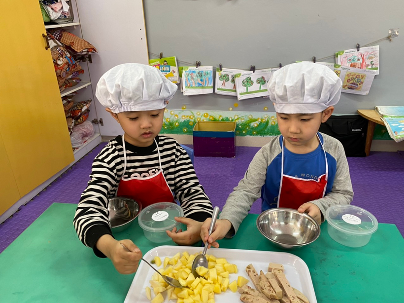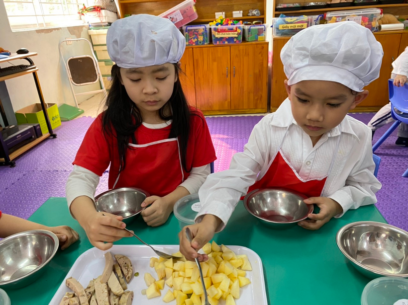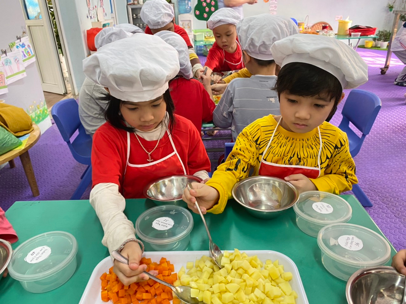 Khâu chuẩn bị và lựa chọn nguyên liệu rất quan trọng, các cô đã lựa chọn những nguyên liệu dễ ăn mà trẻ lại rất thích như: khoai tây, carot, táo, giò, đậu Hà Lan…và 1 nguyên liệu làm nên món ăn đó chính là sốt Mayonnaise. Các con được trải nghiệm từ khâu cắt nguyên liệu rồi trộn với nhau cùng sốt mayonnaise để tạo nên món salad vô cùng hấp dẫn. Được tự tay làm món ăn mà mình thích, các con rất hào hứng. Sau đây là một số hình ảnh của buổi trải nghiệm