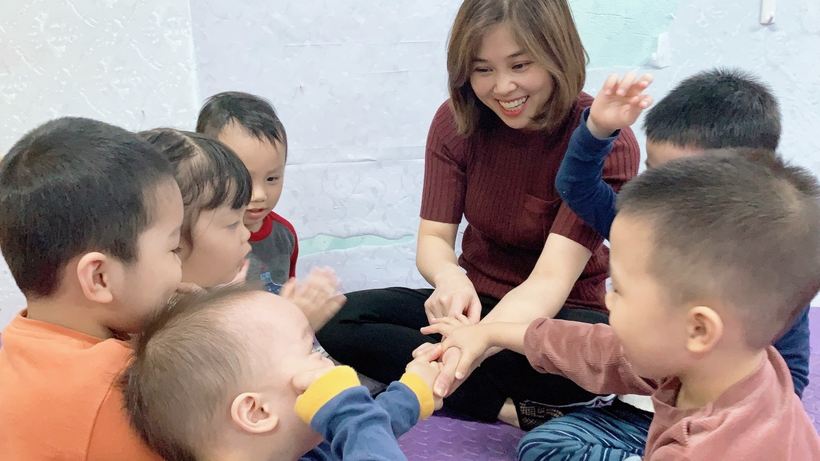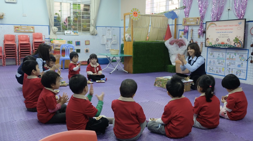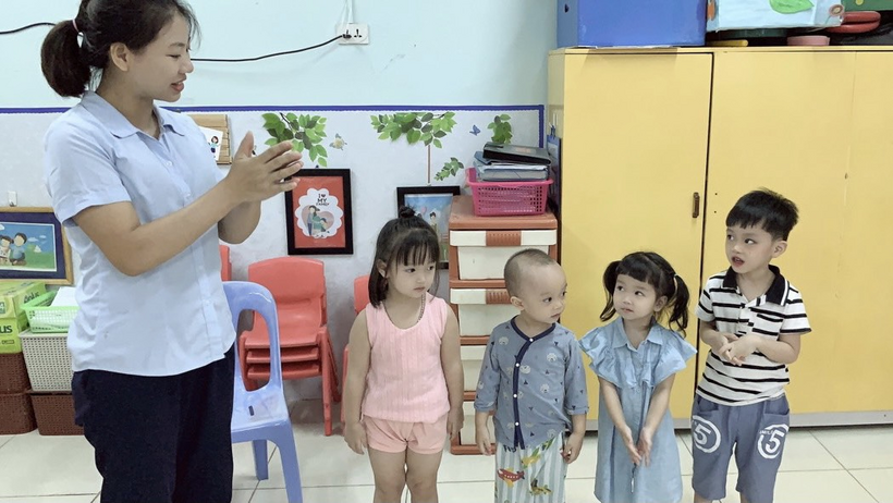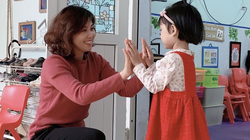 Cô trò chuyện cũng như cùng trẻ vui chơi để tạo sự gần gũi với trẻ hơn, tạo cho trẻ có sự giao lưu với cô và các bạn.