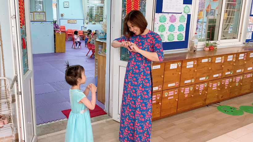 Ngày nào cũng vậy, bé đeo balo đến lớp với một tâm thế vui vẻ và hào hứng là niềm vui lớn nhất đối với các cô giáo. Ở đây, các cô là người mẹ thứ hai của trẻ. Các cô đón trẻ vào lớp với ánh mắt trìu mến,ân cần gần gũi và nụ cười rạng rỡ trên môi.Với cái ôm tình cảm,cái đập tay với cô hay trái tim yêu thương trao gửi sẽ tạo cho trẻ cảm giác được yêu thương được an toàn.Chính vì vậy khi đến lớp trẻ sẽ có tâm thế thoải mái ,vui vẻ,hứng thú,khỏe khoắn để bước vào các hoạt động trong ngày với cả sự hứng thú háo hức và mong chờ.