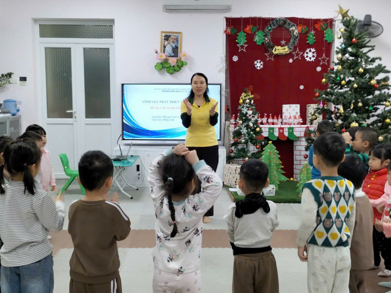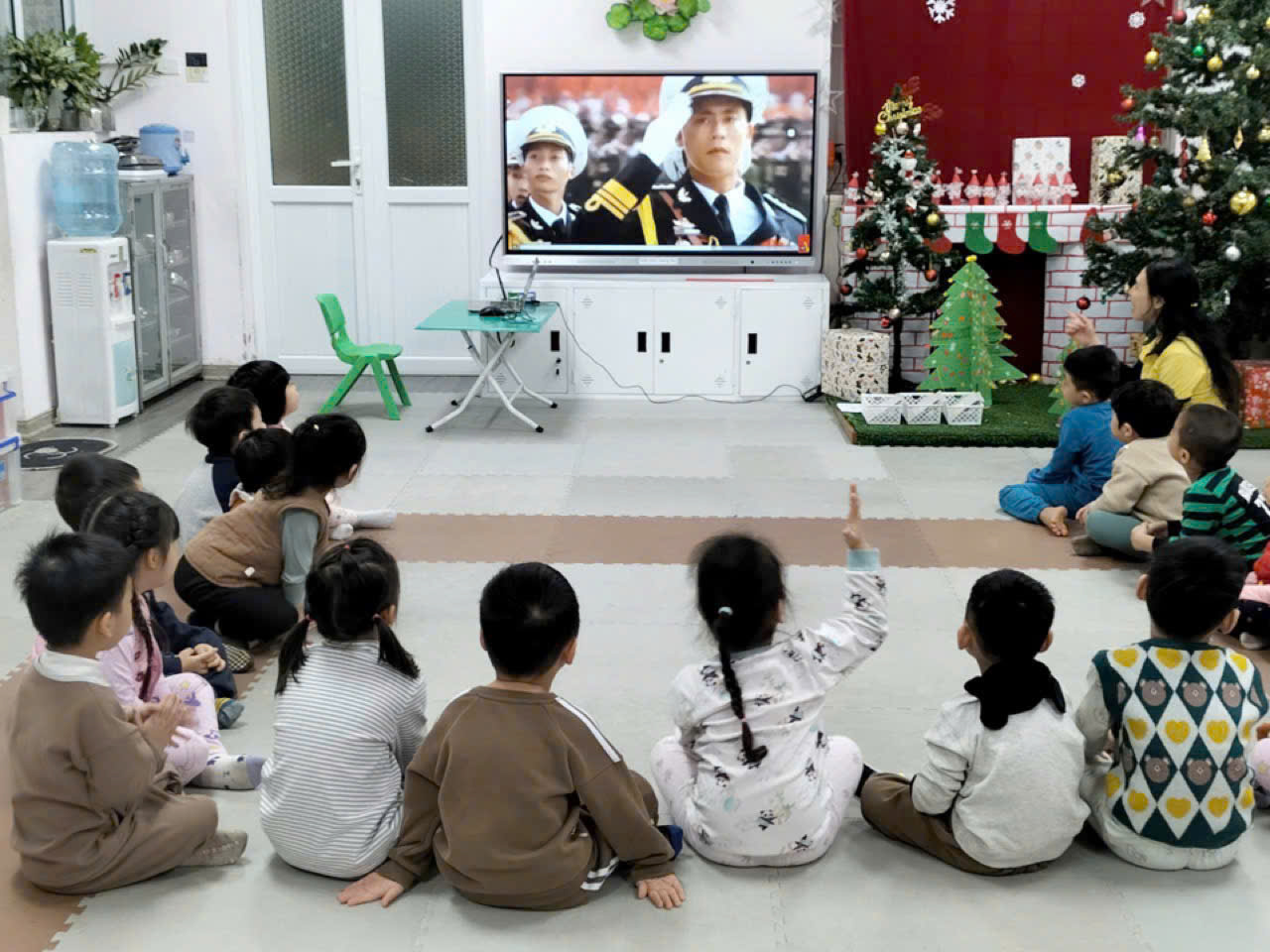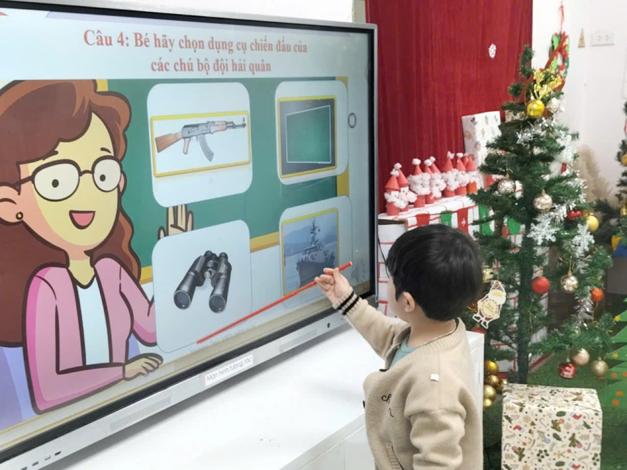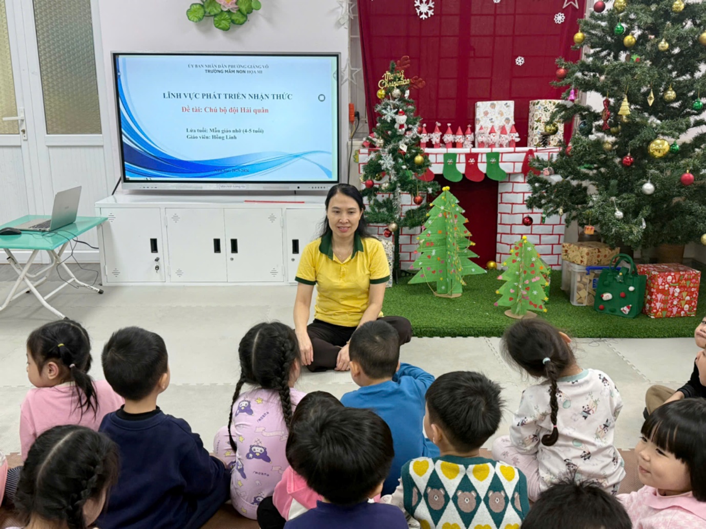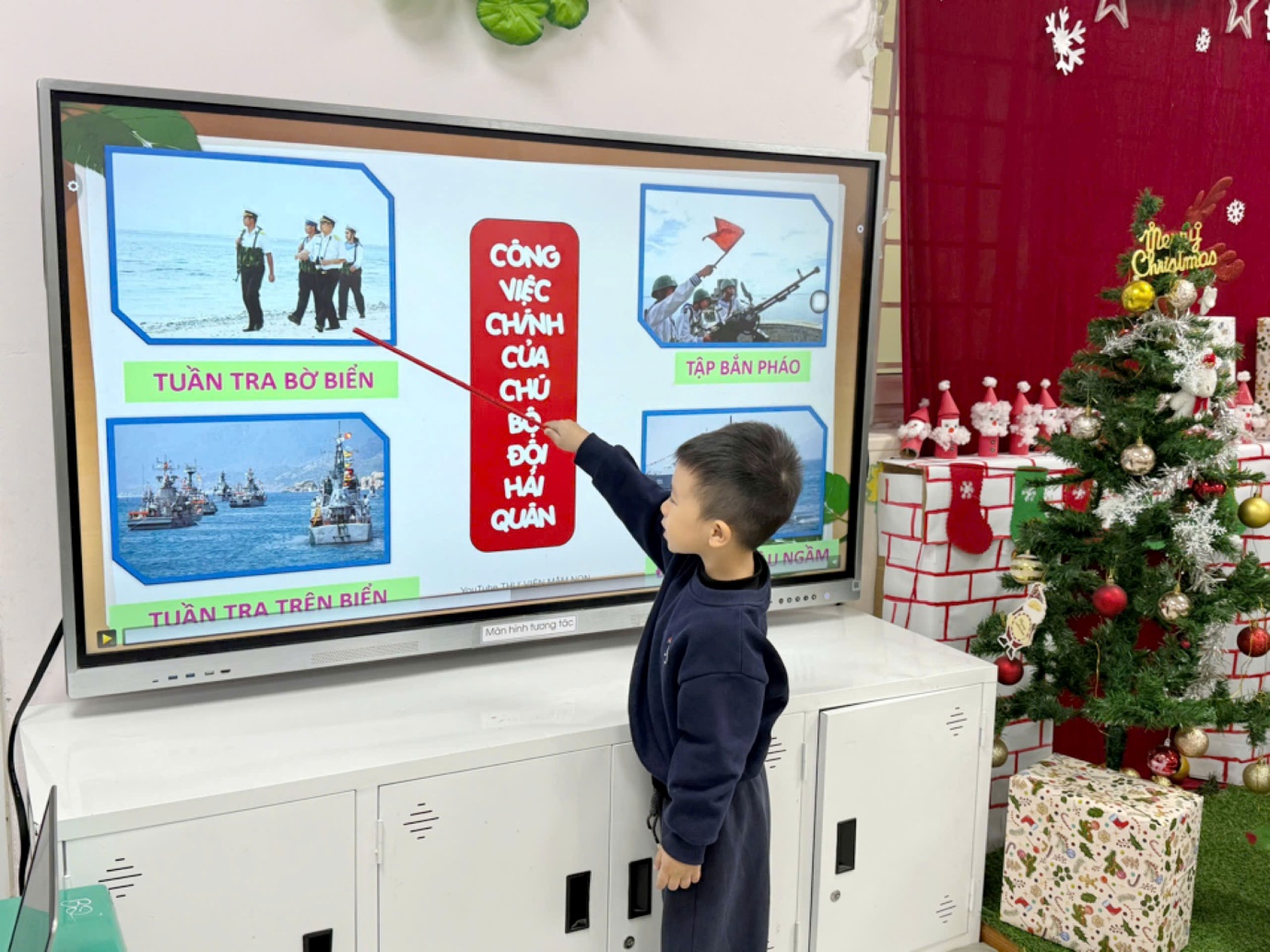 Thông qua hoạt động, các bé được làm quen với hình ảnh chú bộ đội Hải quân – những người ngày đêm canh giữ biển trời Tổ quốc. Dưới sự hướng dẫn tận tình của giáo viên, trẻ được quan sát tranh ảnh, video minh họa về tàu hải quân, quân phục, mũ hải quân và nhiệm vụ của các chú. Những câu hỏi gợi mở, gần gũi giúp trẻ hiểu rằng chú bộ đội Hải quân là những người dũng cảm, kiên cường, luôn bảo vệ chủ quyền biển đảo thiêng liêng của đất nước.