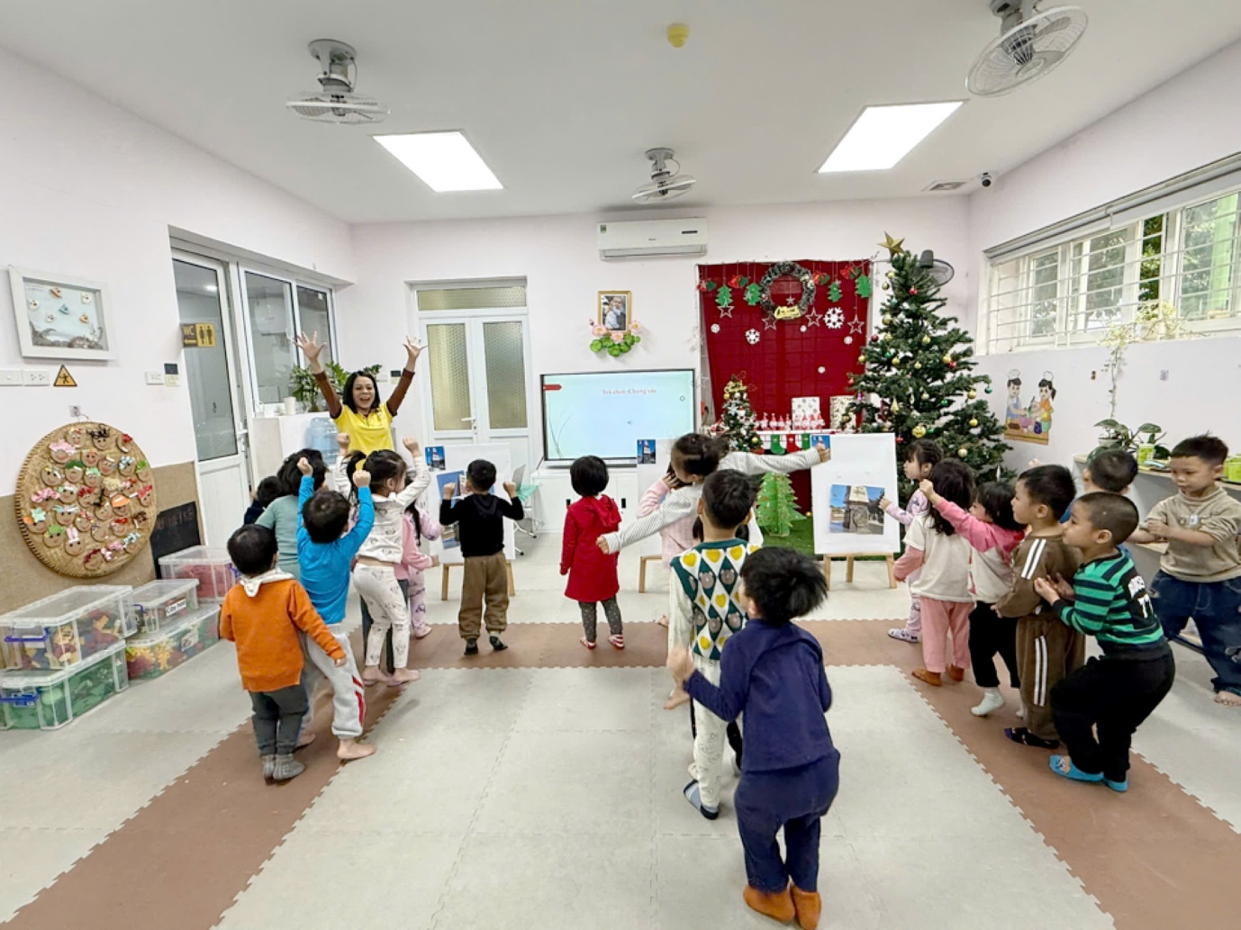 Không chỉ dừng lại ở việc lắng nghe và quan sát, các bé lớp B2 còn được tham gia nhiều hoạt động trải nghiệm hấp dẫn như: trò chơi “Ai nhanh – Ai đúng”, các bé được tham gia trả lời các câu hỏi và lựa chọn hình ảnh đúng liên quan đến trang phục, công việc và nơi làm việc của chú bộ đội Hải quân. Trẻ nhanh chóng nhận biết quân phục hải quân, tàu chiến, biển đảo; hiểu được nhiệm vụ của các chú là bảo vệ vùng biển, hải đảo của Tổ quốc. Không khí trò chơi diễn ra sôi nổi, các bé hào hứng giơ tay, mạnh dạn trả lời, thể hiện sự tự tin và hiểu biết của mình.