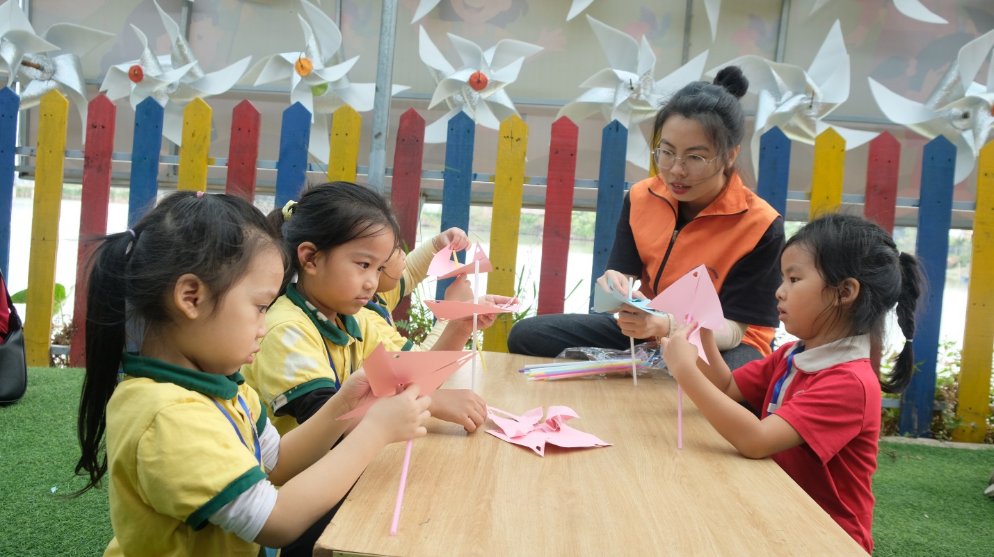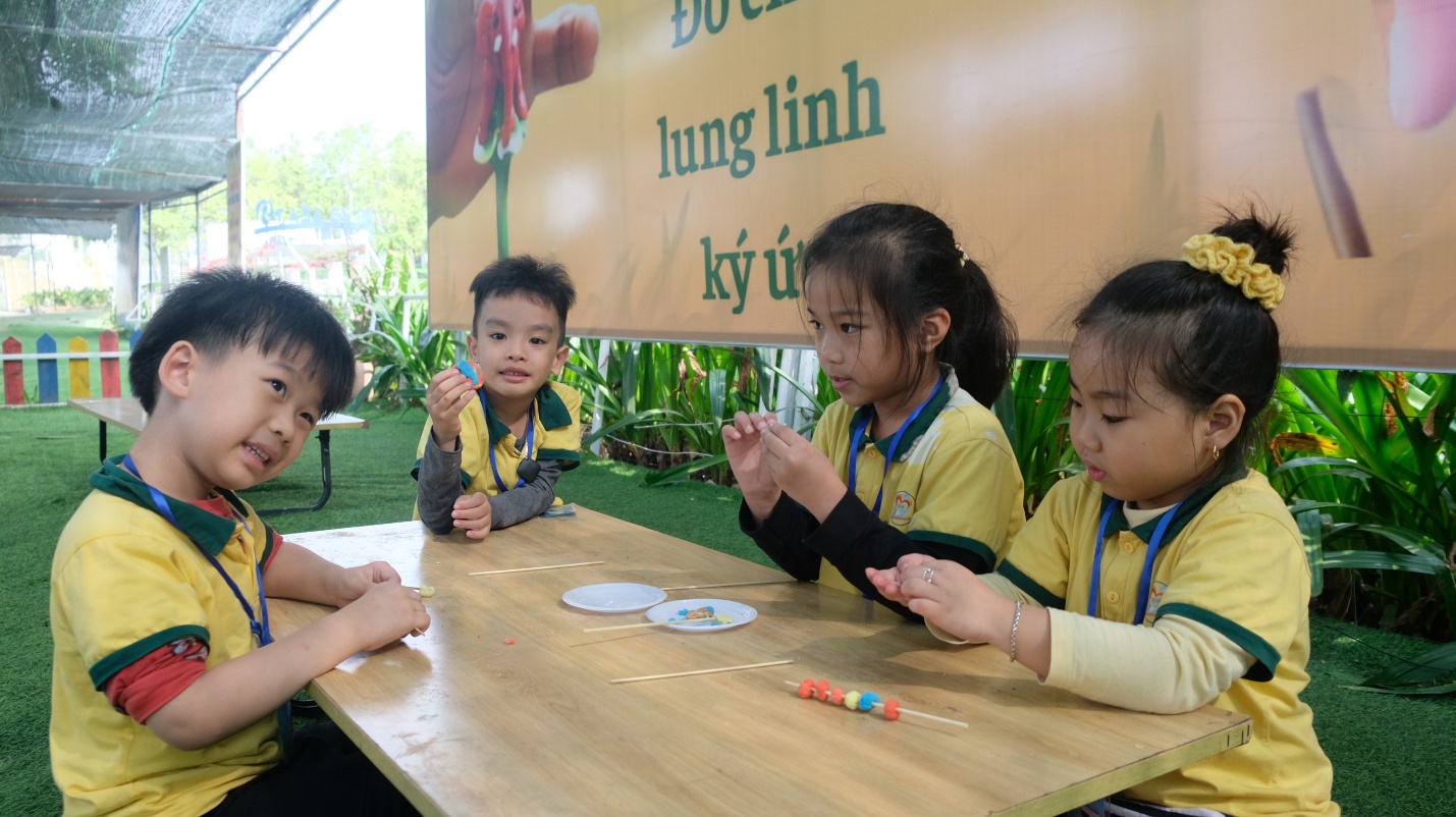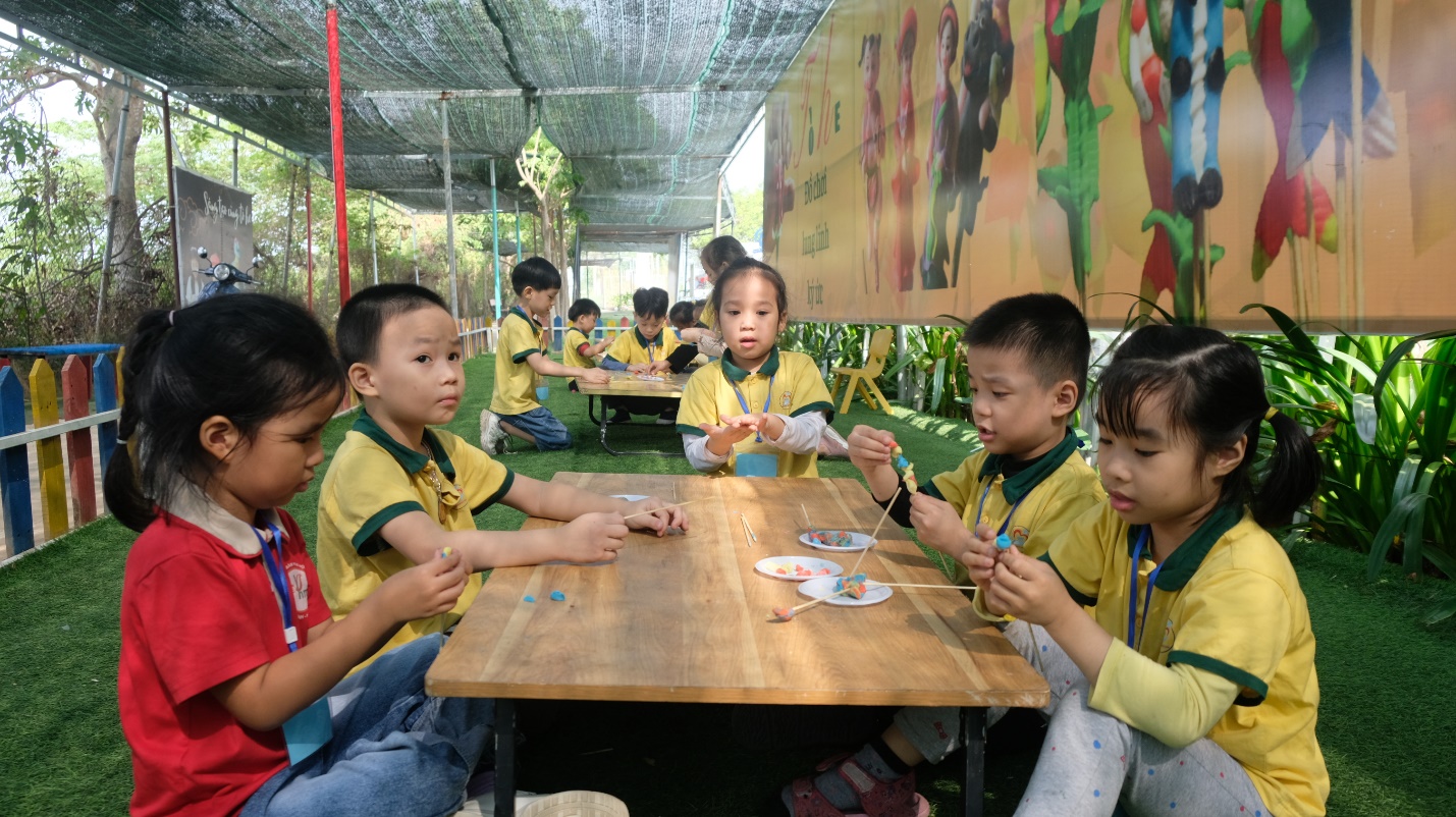 Chưa dừng lại ở đó, các bé bước vào khu trải nghiệm sáng tạo. Các bé được tự tay làm những chiếc chong chóng giấy đầy màu sắc và nặn tò he thành những hình thù đáng yêu, mang đậm dấu ấn riêng.
