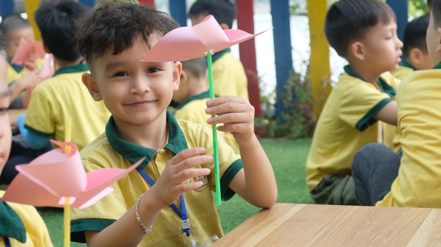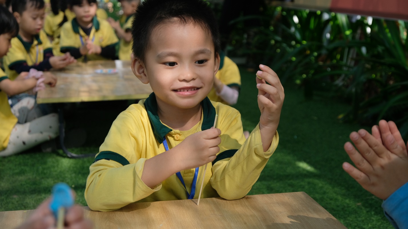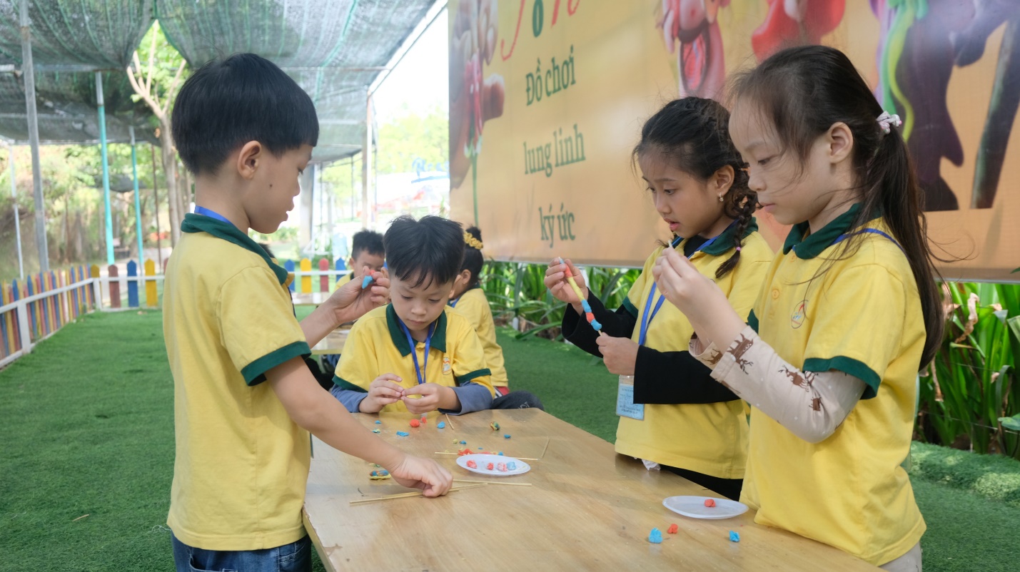 Chưa dừng lại ở đó, các bé bước vào khu trải nghiệm sáng tạo. Các bé được tự tay làm những chiếc chong chóng giấy đầy màu sắc và nặn tò he thành những hình thù đáng yêu, mang đậm dấu ấn riêng.