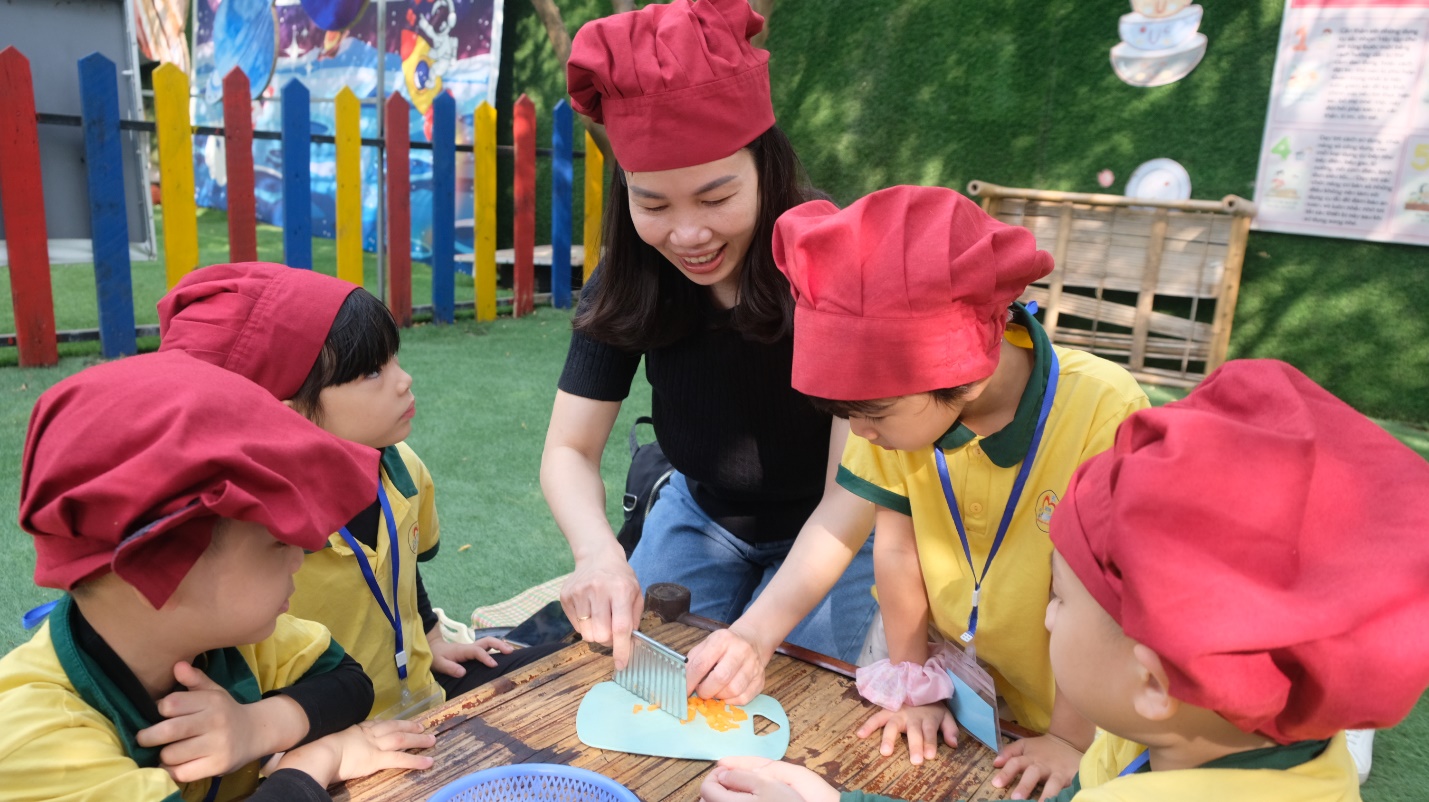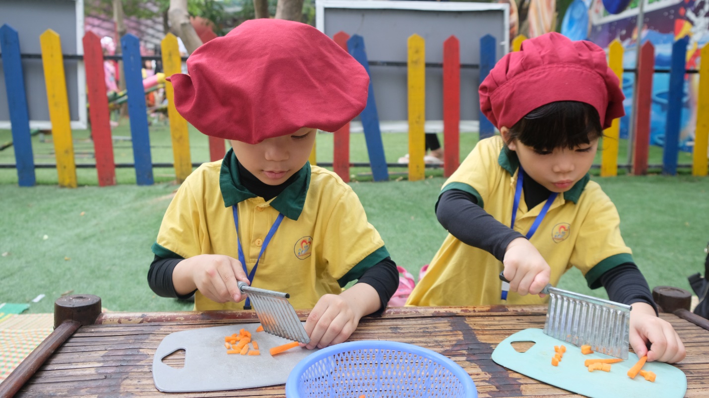 Ngay từ sáng, các bé được tham gia hoạt động "Đầu bếp nhí". Với sự hướng dẫn của các cô chú nhân viên, các bé tự tay thái cà rốt, dưa chuột và háo hức chuẩn bị nguyên liệu cho món cơm rang. Dù những lát cắt chưa thật sự đều, các bé vẫn rất tự hào vì đã hoàn thành nhiệm vụ của mình.
