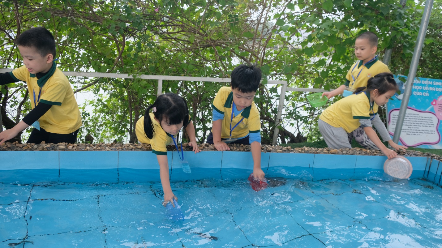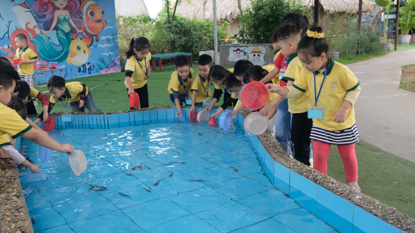 Hoạt động ngoài trời tiếp tục với khu vực bắt cá và đi thuyền trên hồ. Các bé hóa thân thành ngư dân nhí, tận hưởng cảm giác được tự tay bắt cá trong làn nước mát. Ngồi trên chiếc thuyền nhỏ trôi lững lờ trên hồ cũng mang lại cho các bé những khoảnh khắc thư giãn và gần gũi với thiên nhiên.