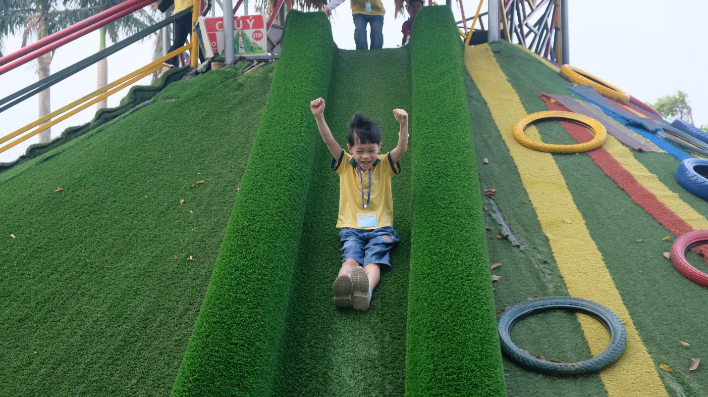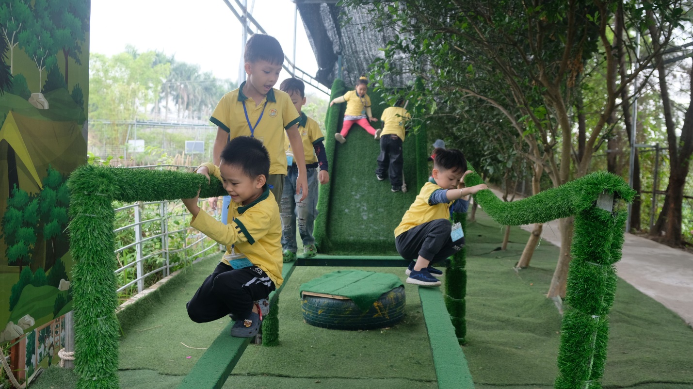 Buổi chiều, các bé bước vào hành trình chinh phục các trò chơi vận động. Các thử thách như làm chiến binh rừng xanh vượt qua chướng ngại vật, trượt cỏ, kéo co… đã mang đến những tiếng reo hò và cổ vũ rộn rã. Không chỉ rèn luyện thể lực, các bé còn học được tinh thần đồng đội và sự kiên trì khi hoàn thành từng trò chơi.