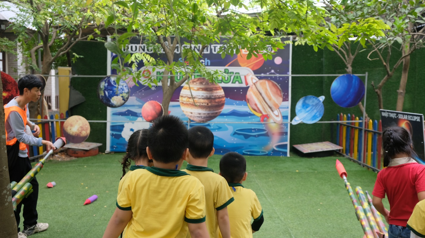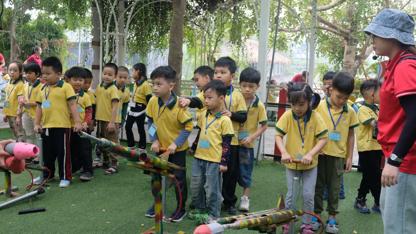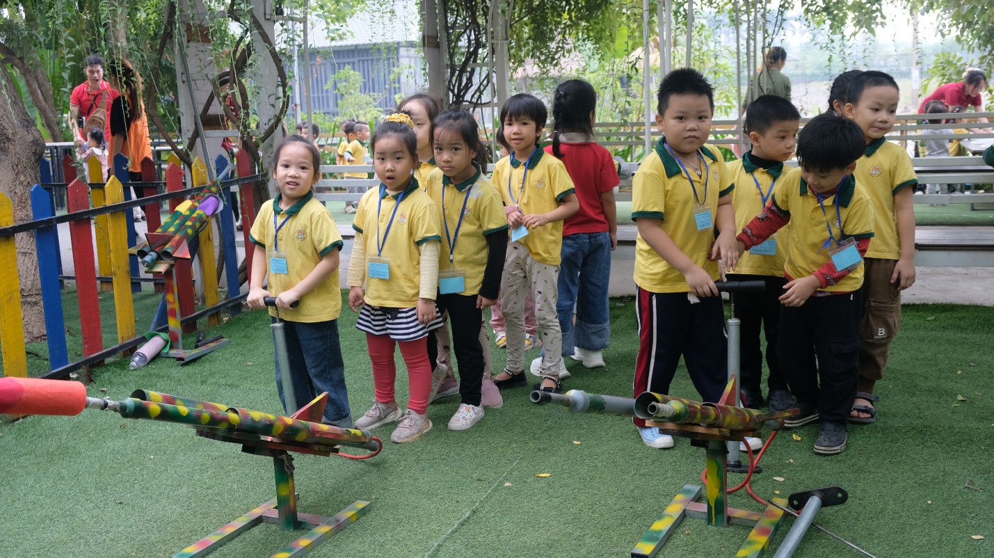 Tiếp đó, khu vực bắn tên lửa đã làm các bé tràn ngập niềm vui. Từng chiếc tên lửa giấy bay cao giữa bầu trời xanh, mang theo tiếng cười giòn tan và ánh mắt lấp lánh của các bé.
