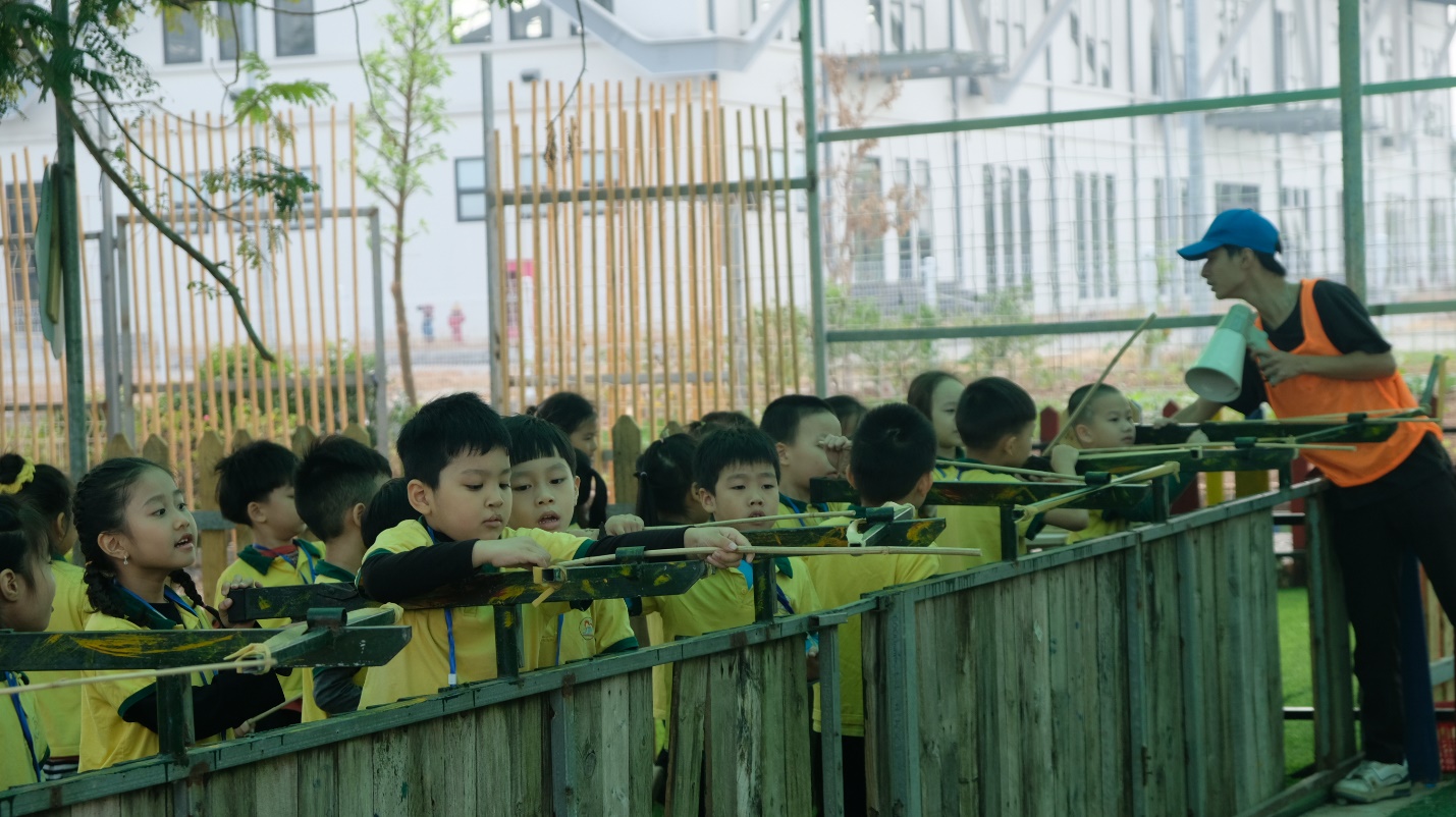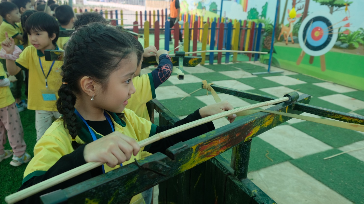Tiếp đến, các bé lại thử sức làm xạ thủ với những chiếc cung tên bằng tre rất thú vị.