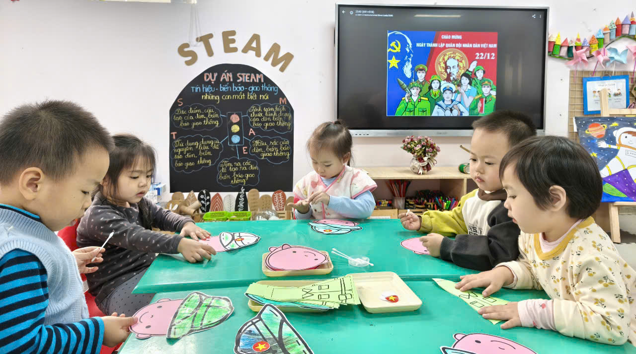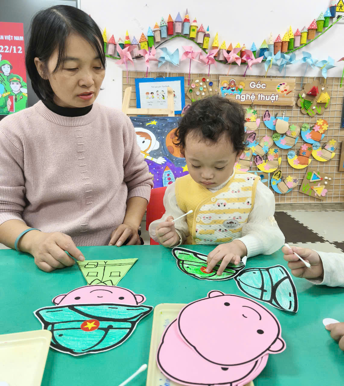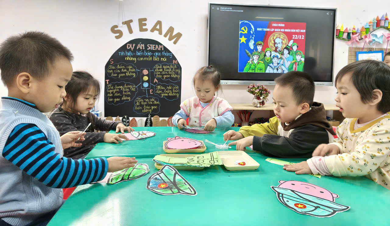 Bên cạnh đó thông qua các hoạt động học như khám phá, tạo hình, trò chơi, hoạt động ngoài trời… các bé được trang trí, tô màu chú bộ đội, cùng cô vẽ, tô màu báo tường, biểu diễn văn nghệ chào mừng ngày 22/12….