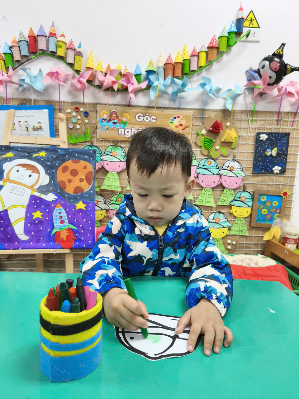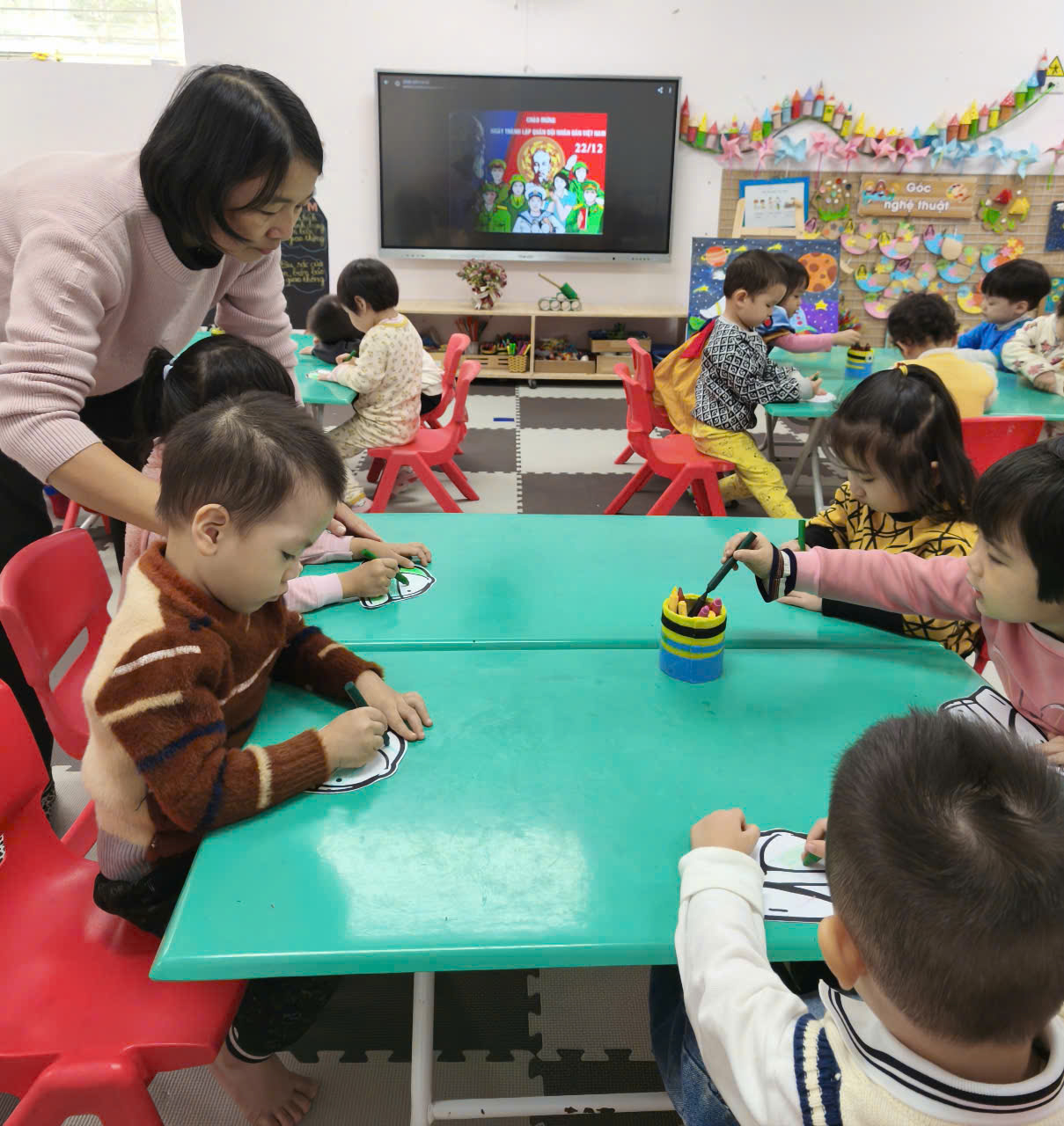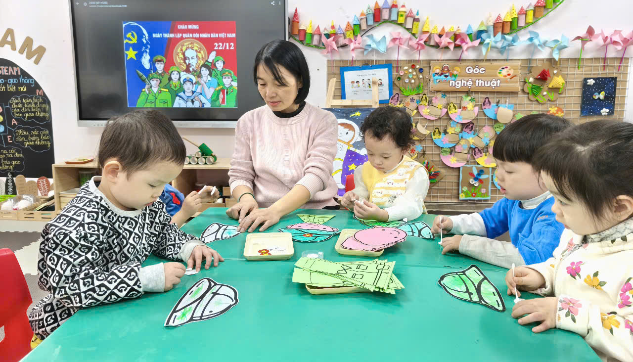 Bên cạnh đó thông qua các hoạt động học như khám phá, tạo hình, trò chơi, hoạt động ngoài trời… các bé được trang trí, tô màu chú bộ đội, cùng cô vẽ, tô màu báo tường, biểu diễn văn nghệ chào mừng ngày 22/12….