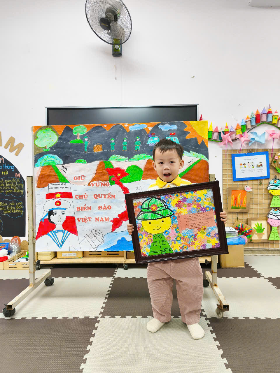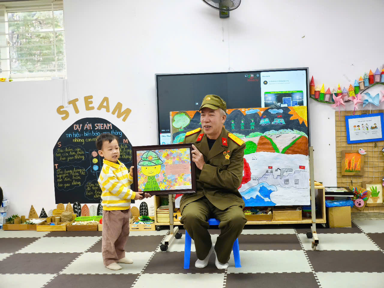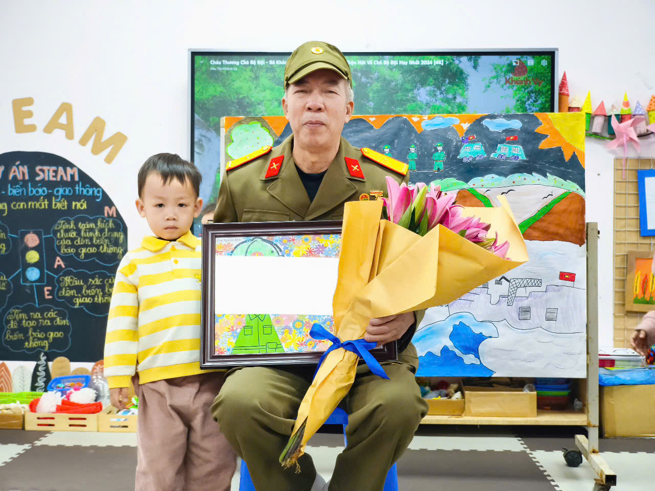 Cháu Nguyên Khôi tặng ông nội của mình bức tranh “Chú bộ đội của em” đến từ đội bàn tay khéo léo của mình và hoàn thiện với sự giúp đỡ của cô giáo.