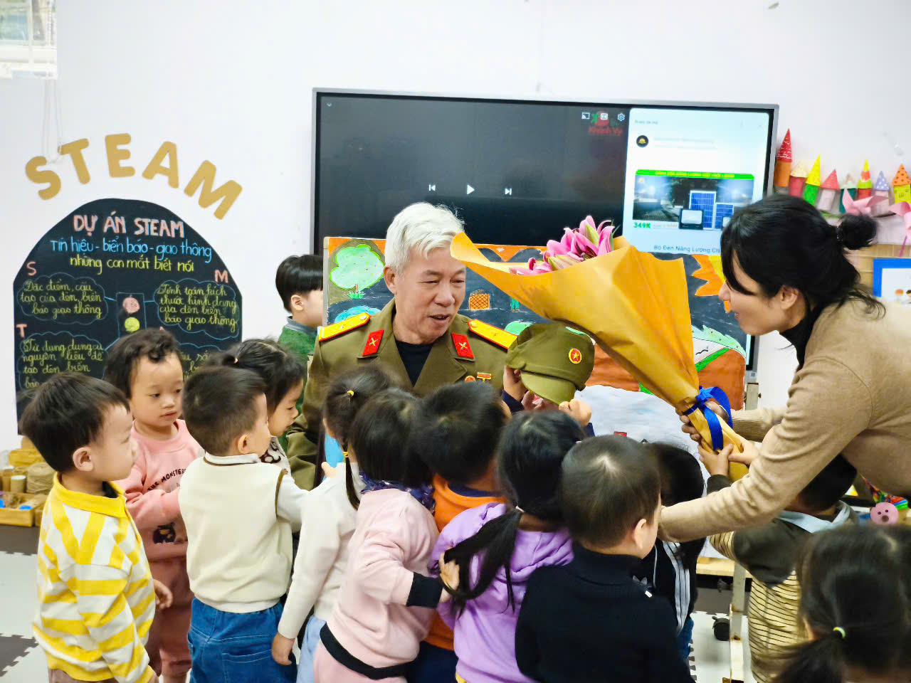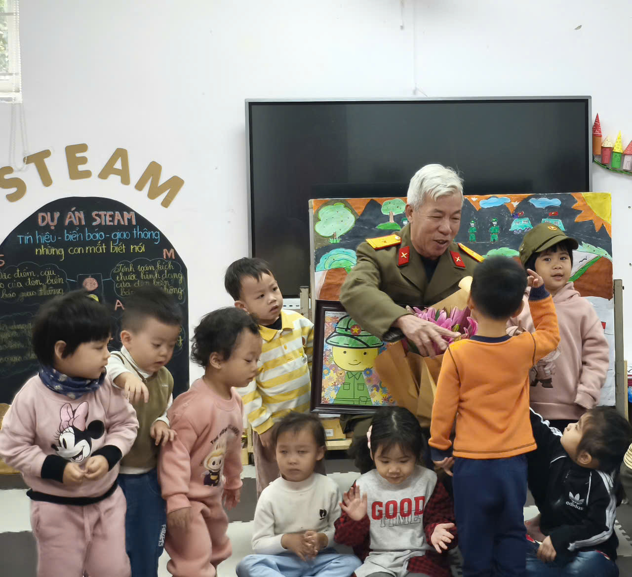 Cô và trò lớp C2 rất vinh dự chào đón sự xuất hiện của 1 vị khách mời đặc biệt đó là Ông An Kiên, ông là cựu chiến binh đã về hưu, ông là Trung sĩ tiểu đội trưởng, Trung đoàn 99 Sư đoàn 472 Binh đoàn 12. Ông đã có buổi chia sẻ gần gũi về quá trình công tác cũng như công việc của mình trong thời gian tại ngũ, các cháu vô cùng thích thú đưa ra những câu hỏi và được ông trả lời, các con có thêm hiểu biết về truyền thống hào hùng của dân tộc, khơi gợi tình yêu quê hương đất nước. Trong buổi giao lưu các bạn nhỏ đã đọc thơ, hát những bài thơ bài hát về chú bộ đội dành tặng ông, ông rất xúc động.