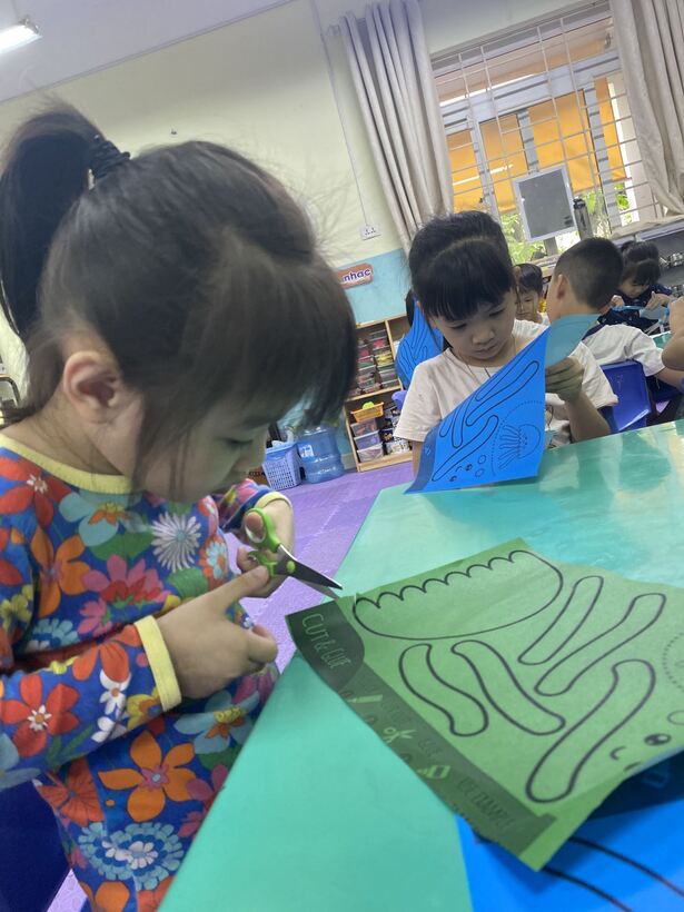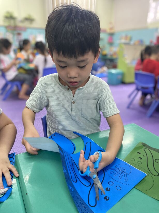 Sau đây là những hình ảnh của các bé lớp A3-A4 tập cắt theo hình : chú bạch tuộc đáng yêu :