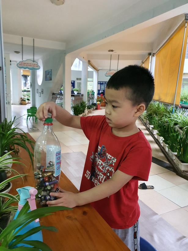 Ý thức được việc đó cô trò lớp B3 đã triển khai một dự án nhỏ là : "Thu gom rác thải nhựa và pin độc hại để bảo vệ môi trường". Thực sự tôi rất vui mừng sau khi phát động kế hoạch nhỏ đã được phụ huynh và các con hoàn toàn ủng hộ. Phụ huynh cùng các con đã thu gom được rất nhiều pin mang đến dể phân loại rác. Ngoài ra phụ huynh cùng các con thu gom rác thải nhựa mang đến lớp để cô trò làm đò chơi tái chế. Các con ngày càng ý thức được việc bảo vệ môi trường bằng việc vứt rác đúng nơi quy định, nhắc nhở người thân hạn chế dùng cốc nhựa một lần. Các con hào hứng chơi với các đồ chơi do mình tự tạo. Niềm vui của cô trò B3 là góp một phần công sức nhỏ bé của mình vào việc bảo vệ môi trường để có được cuộc sống xanh, an toàn và hạnh phúc.