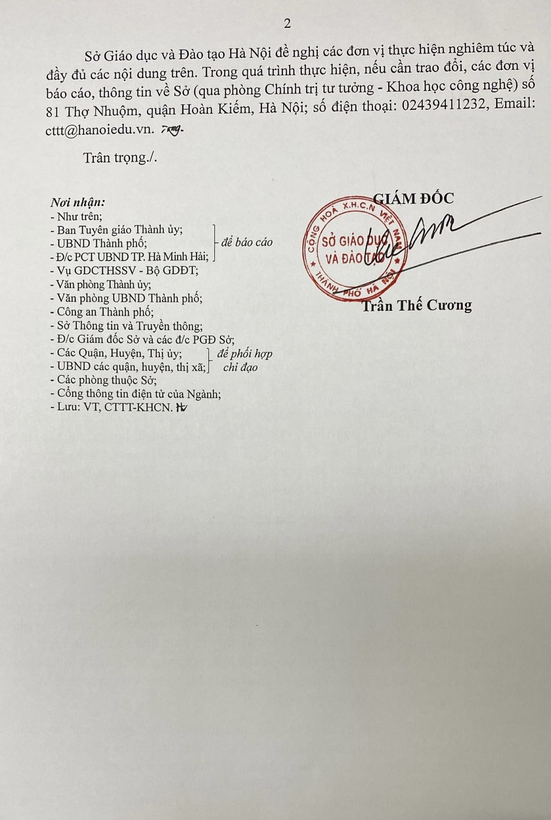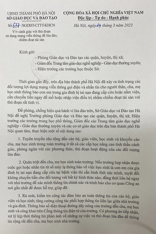 Ngày 14/03/2023, Sở GDĐT thành phố Hà Nội ra công văn số 677/SGDĐT-CTTT-KHCN về việc cảnh giác với thủ đoạn sử dụng mạng viễn thông để lừa đảo, chiếm đoạt tài sản.