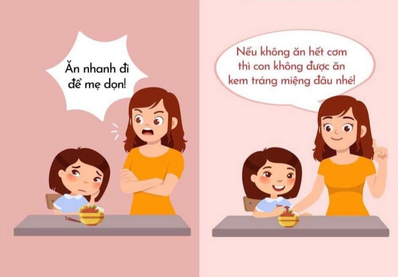 Thay vì la hét, mẹ hãy nói những lời yêu thương để con yêu ăn nhanh hơn.