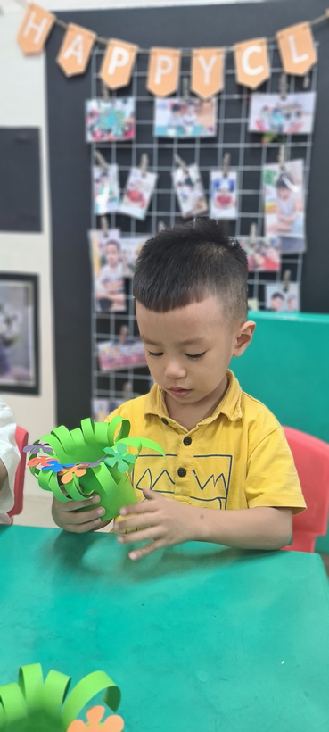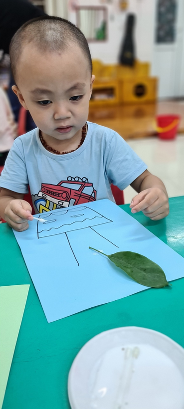 Bé Vũ Lê Minh Khang đã biết sắp xếp và dán những chiếc lá để tạo thành một chậu cây rất đẹp.