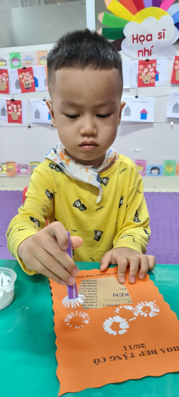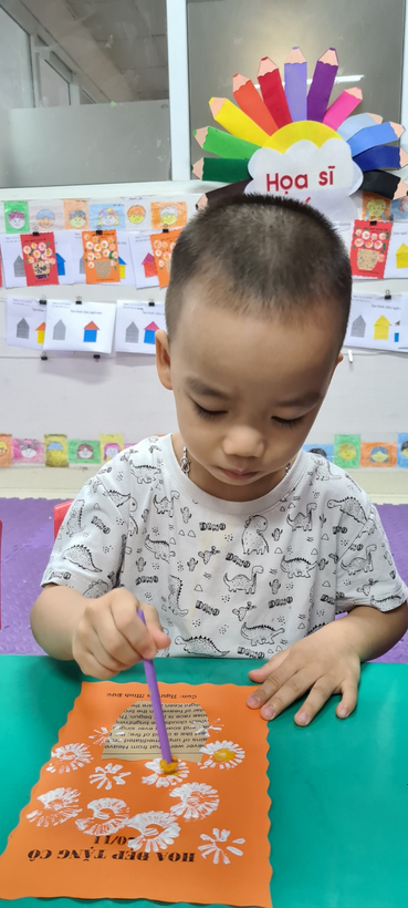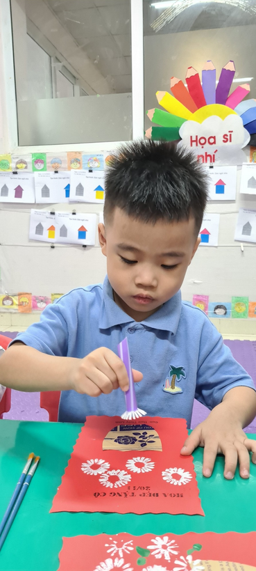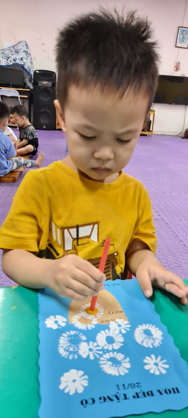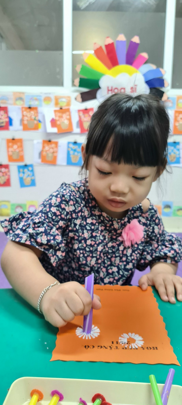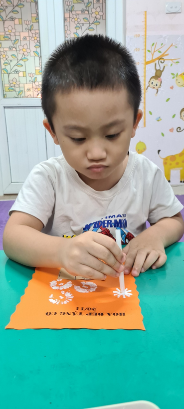 Bé sử dụng ống hút, in màu tạo thành những bông hoa thật xinh để trang trí thiệp chúc mừng cô giáo nhân dịp 20/11
