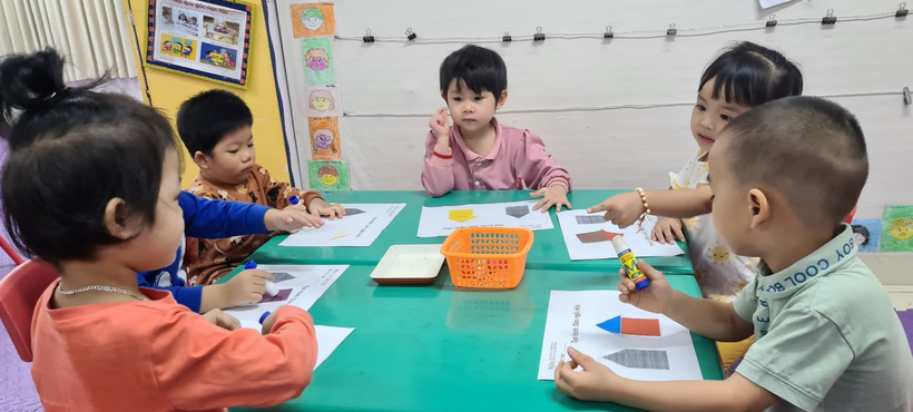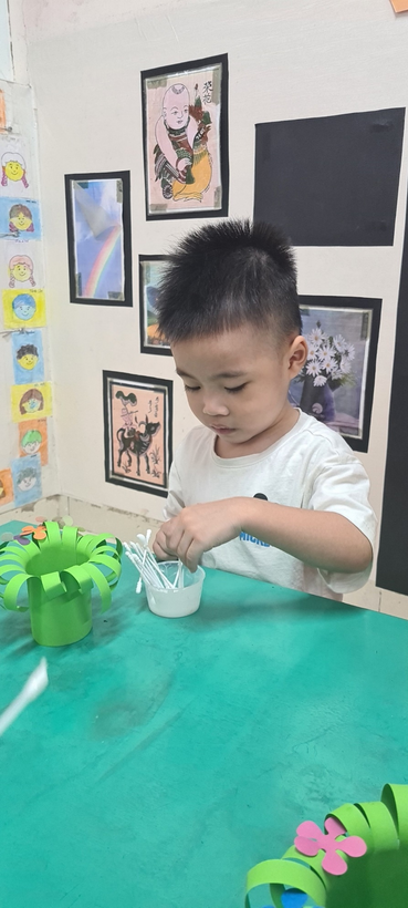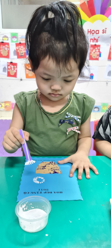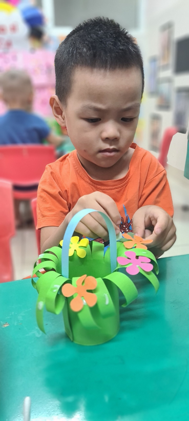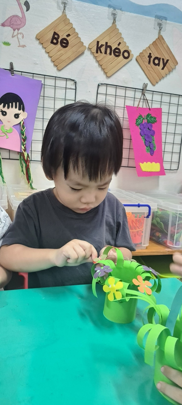 Các bé đã dán hoa cho giỏ hoa thêm sinh động