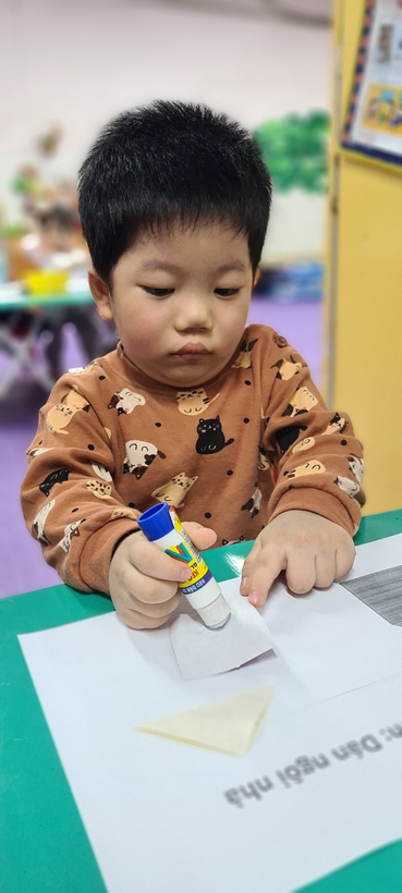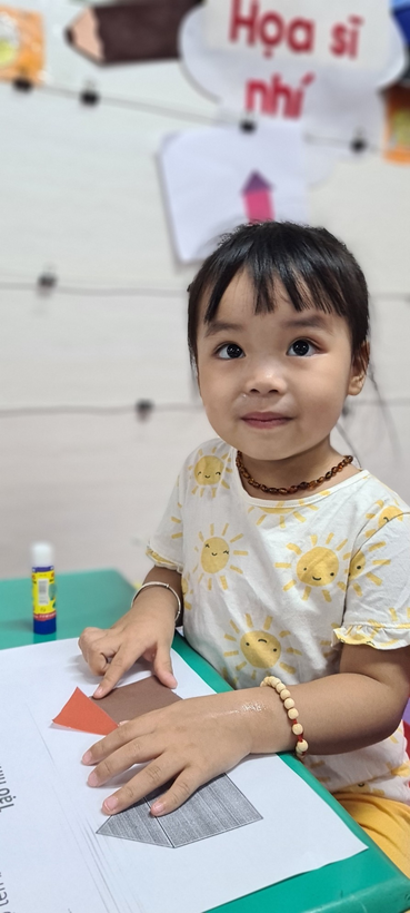 Bé biết lựa chọn những hình cơ bản (hình vuông, hình tam giác) để dán thành hình ngôi nhà thật đẹp.