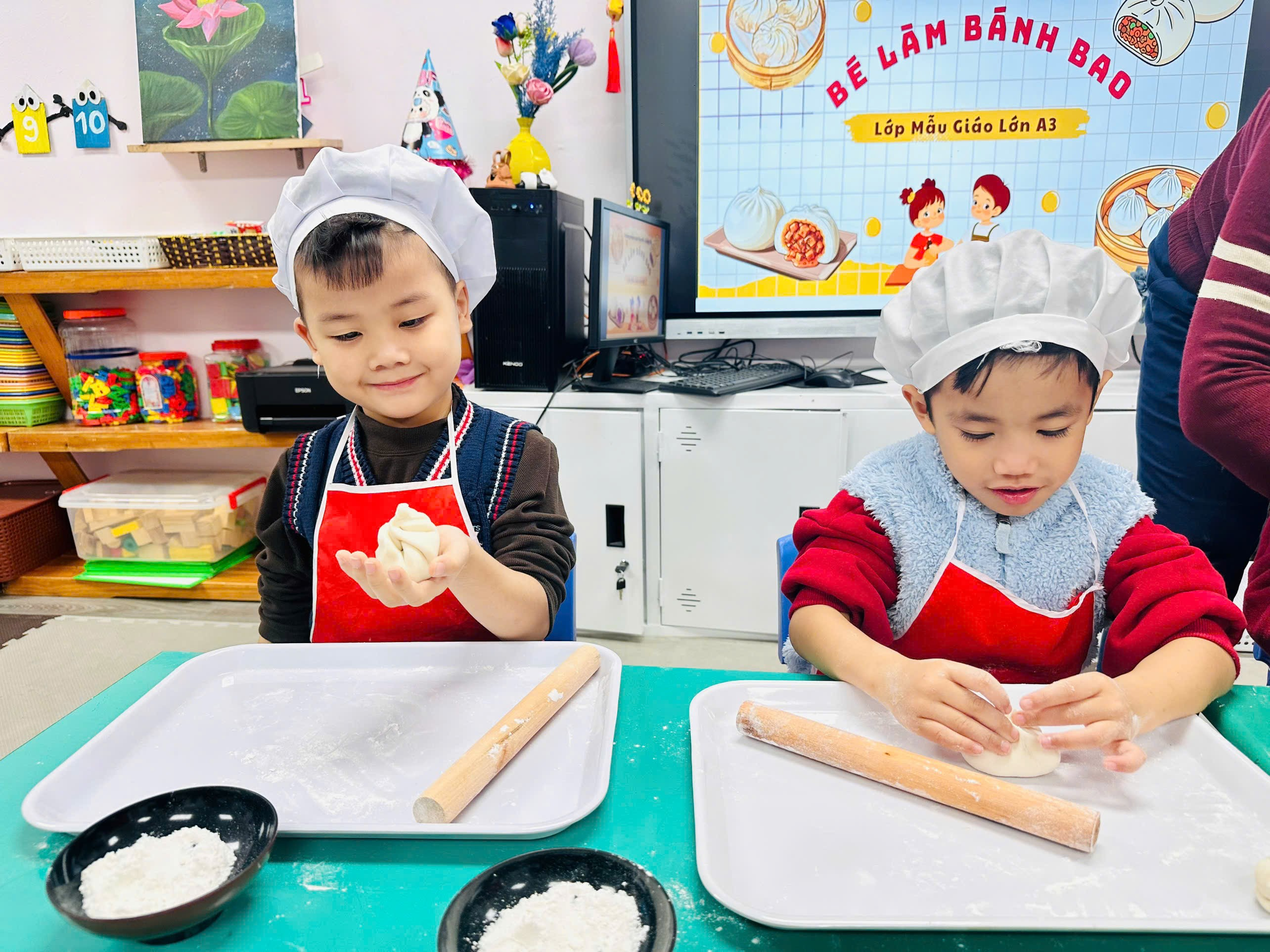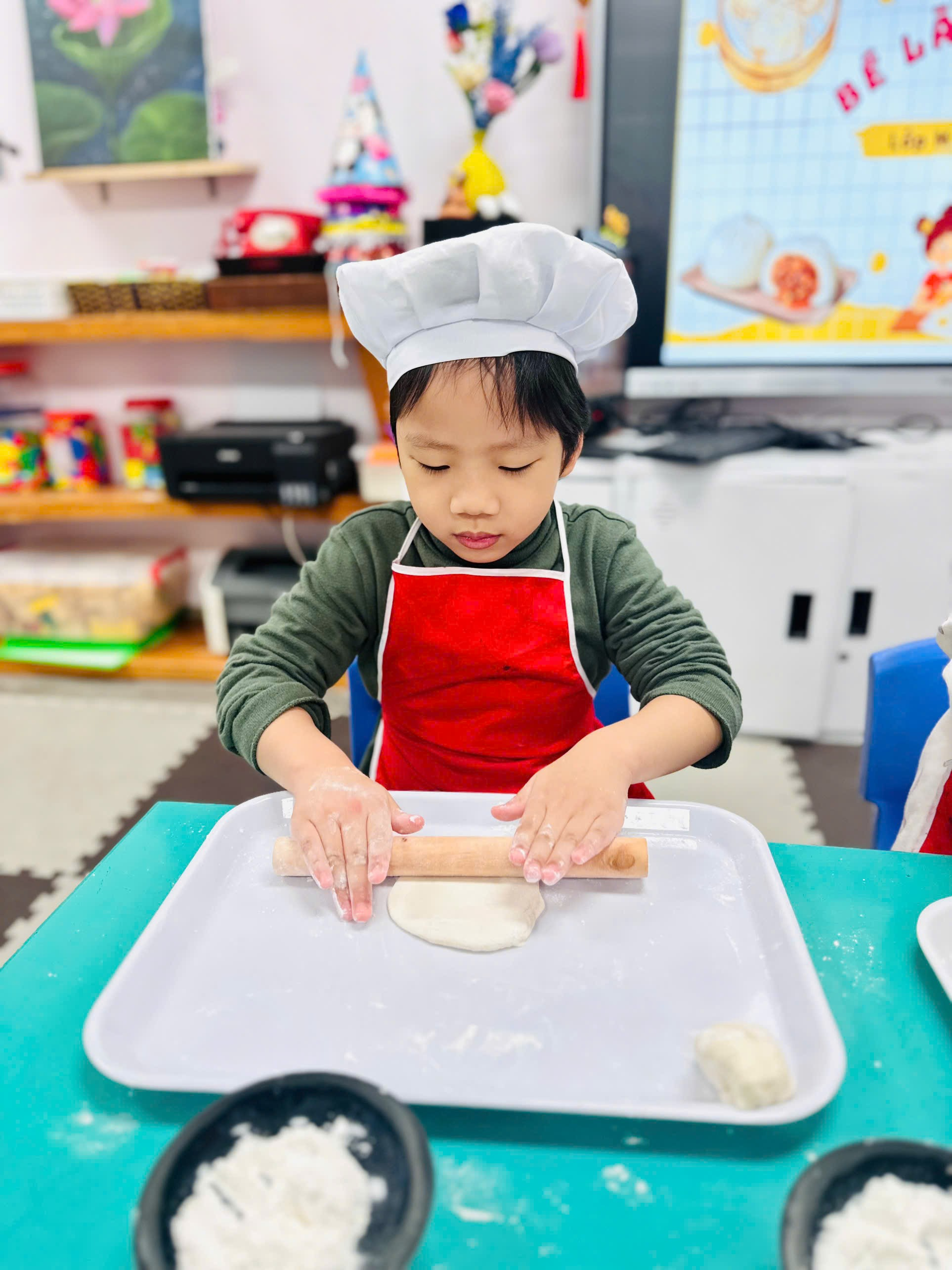 🥰 Không có bài vở chỉ có bột mì mềm mịn, nhân bánh ấm tay… và những bàn tay bé xíu đang rụt rè chạm vào bột lần đầu tiên.