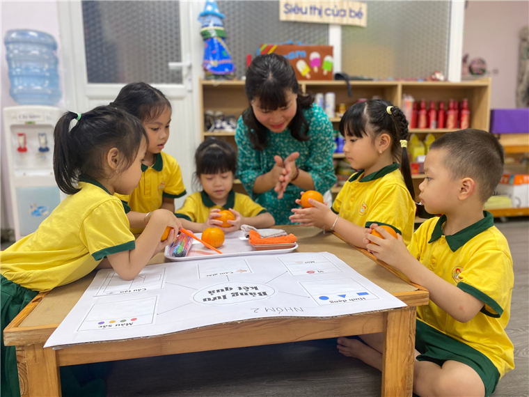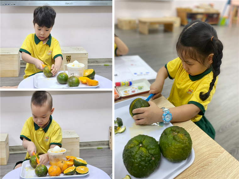 Trẻ tham gia trải nghiệm “Vắt nước cam”.