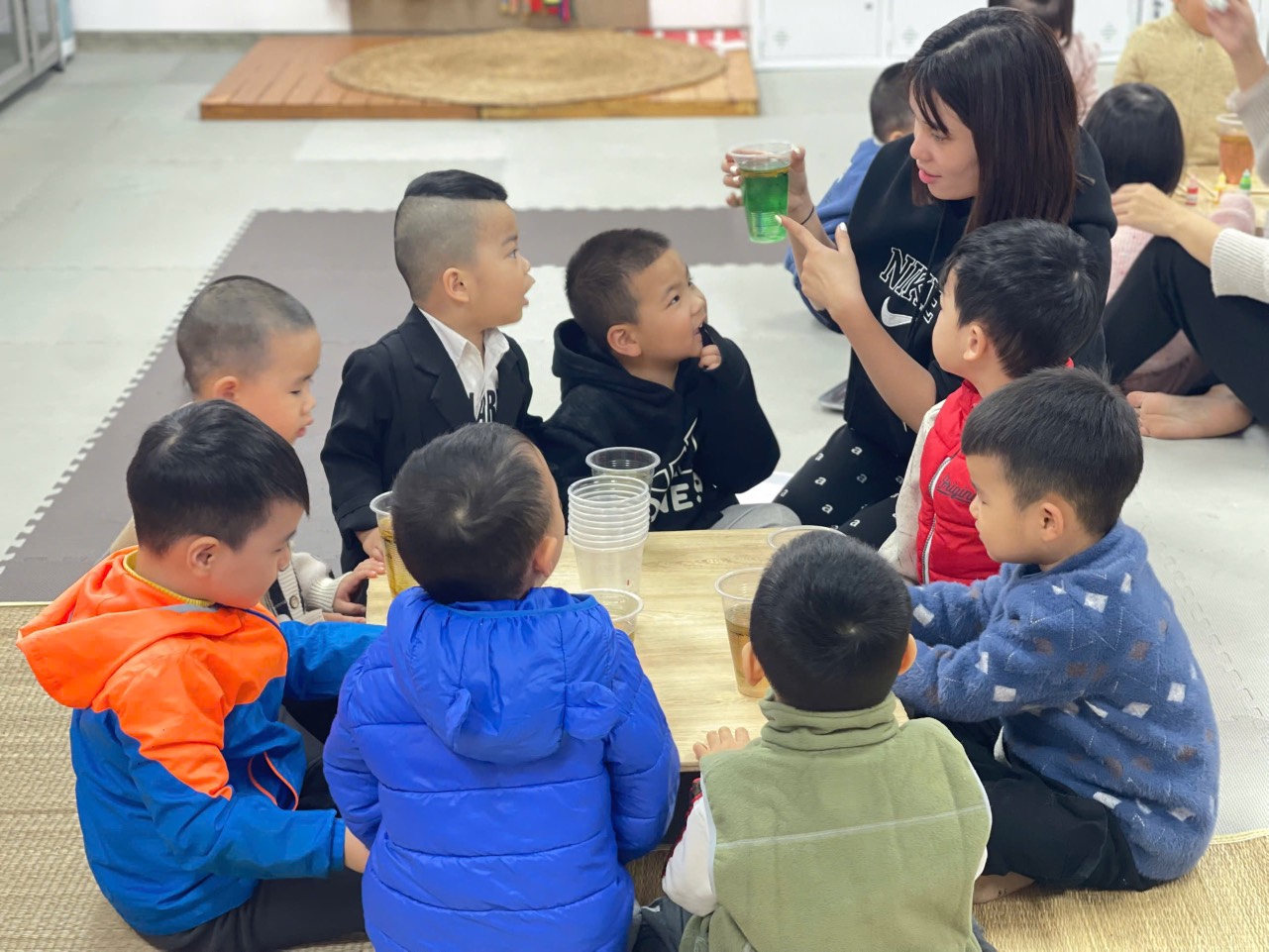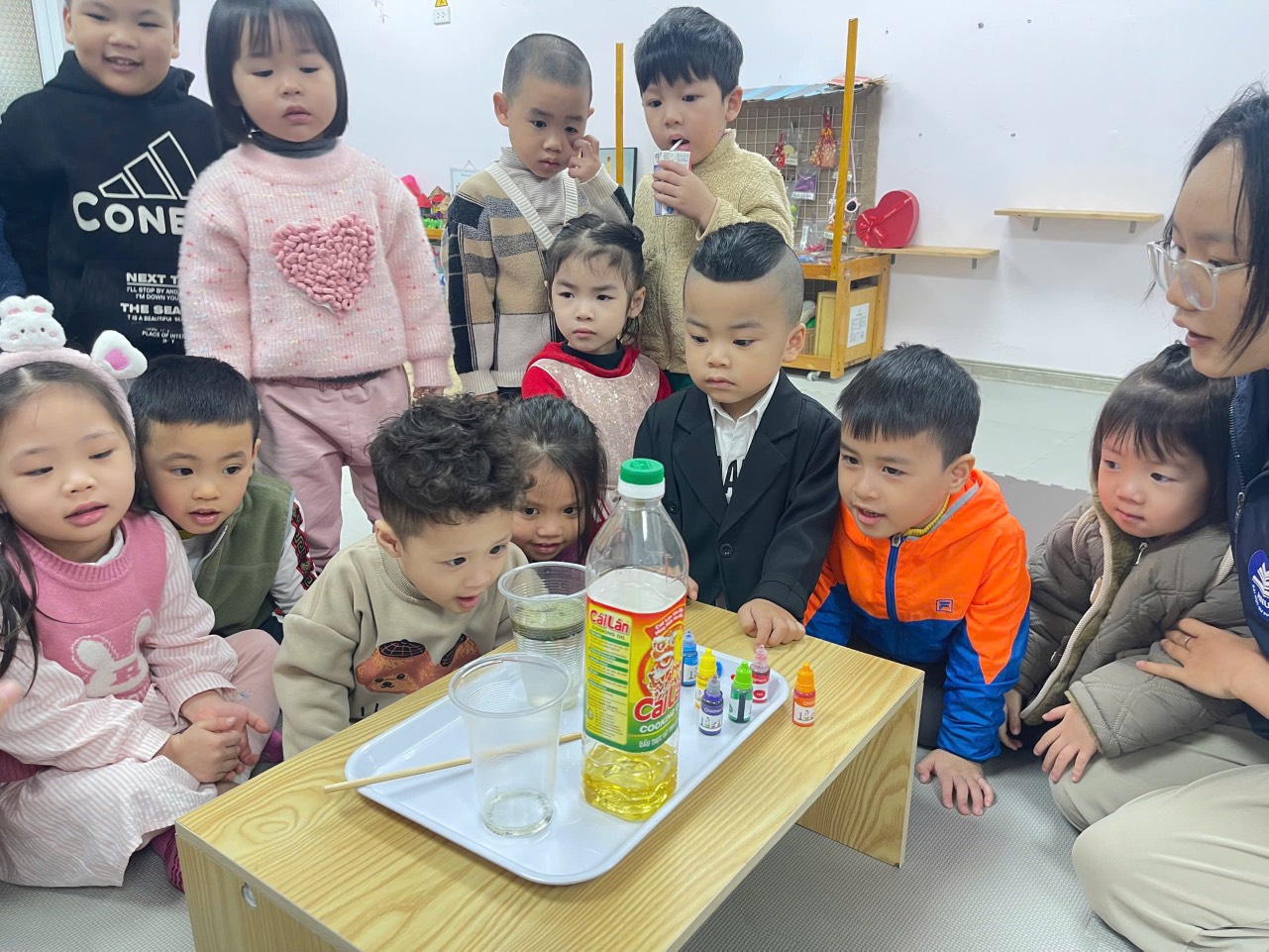 Chỉ với dầu ăn, nước và màu thực phẩm, cả lớp đã tạo nên một "cơn mưa kỳ diệu". Những giọt màu rơi xuống nước, loang dần ra như những dải cầu vồng nhỏ xíu, đẹp đến ngỡ ngàng. Thí nghiệm không chỉ khiến các bé thích thú mà còn giúp con hiểu về sự hòa tan và những điều kỳ diệu ẩn giấu trong khoa học.