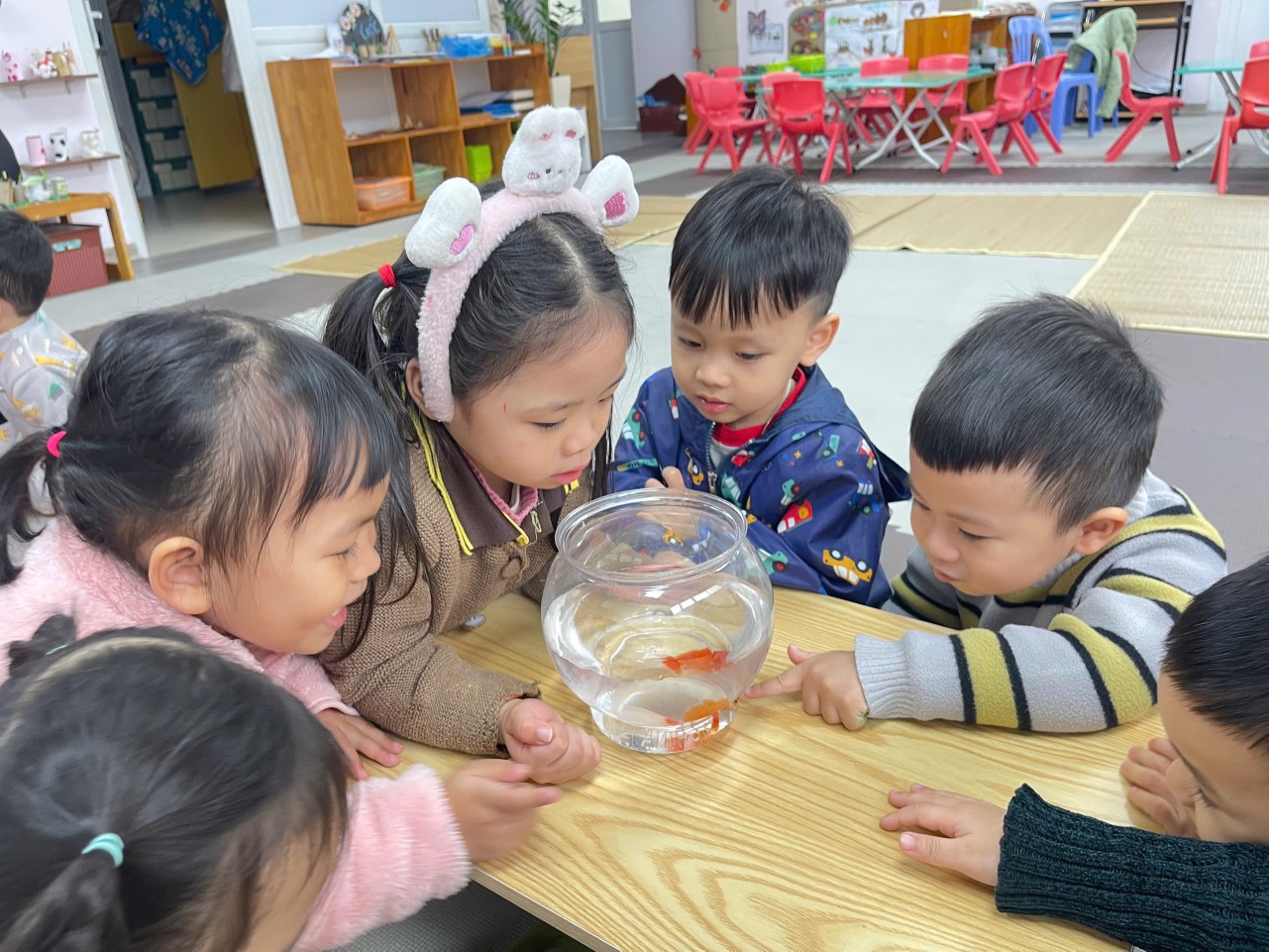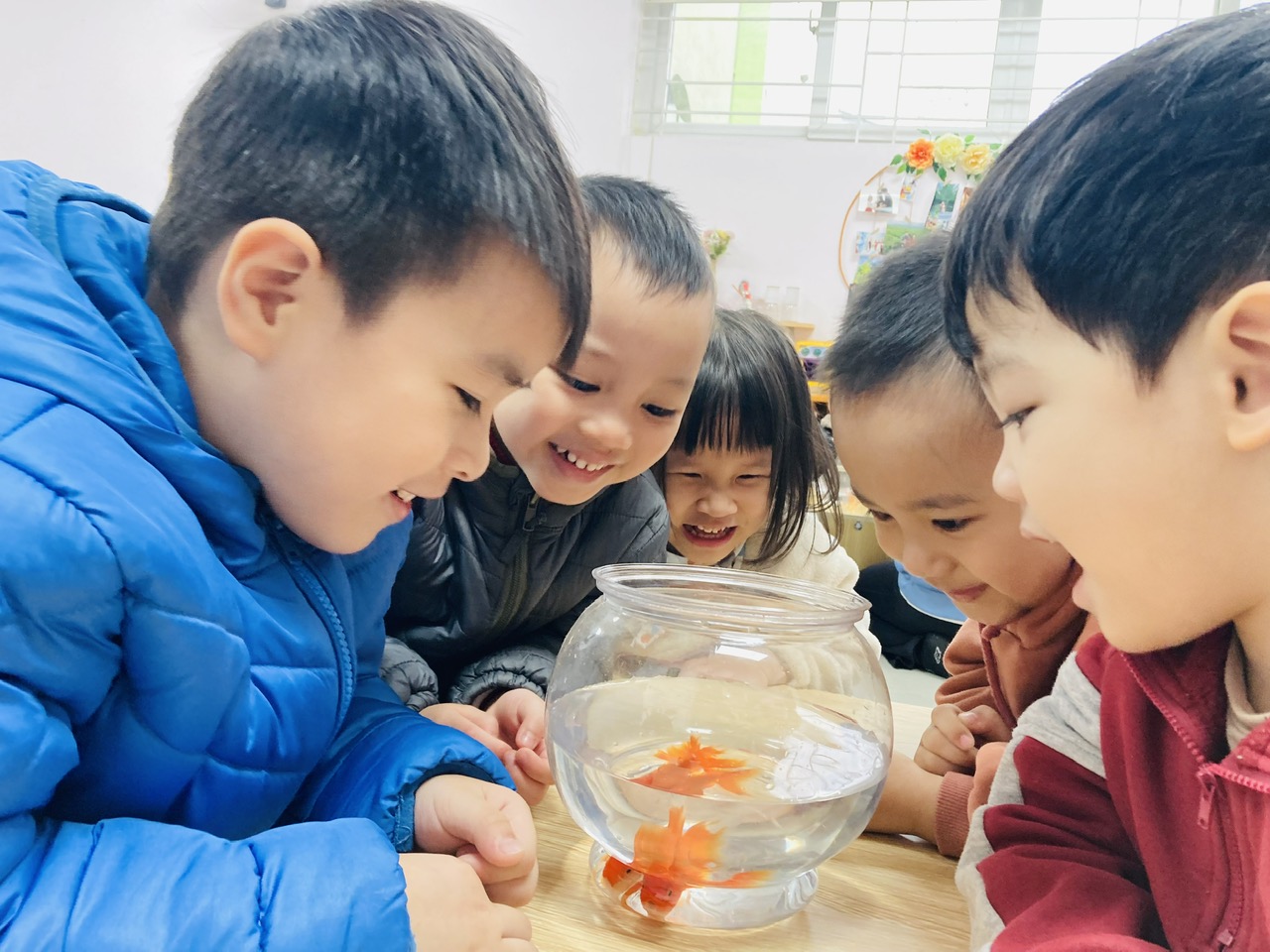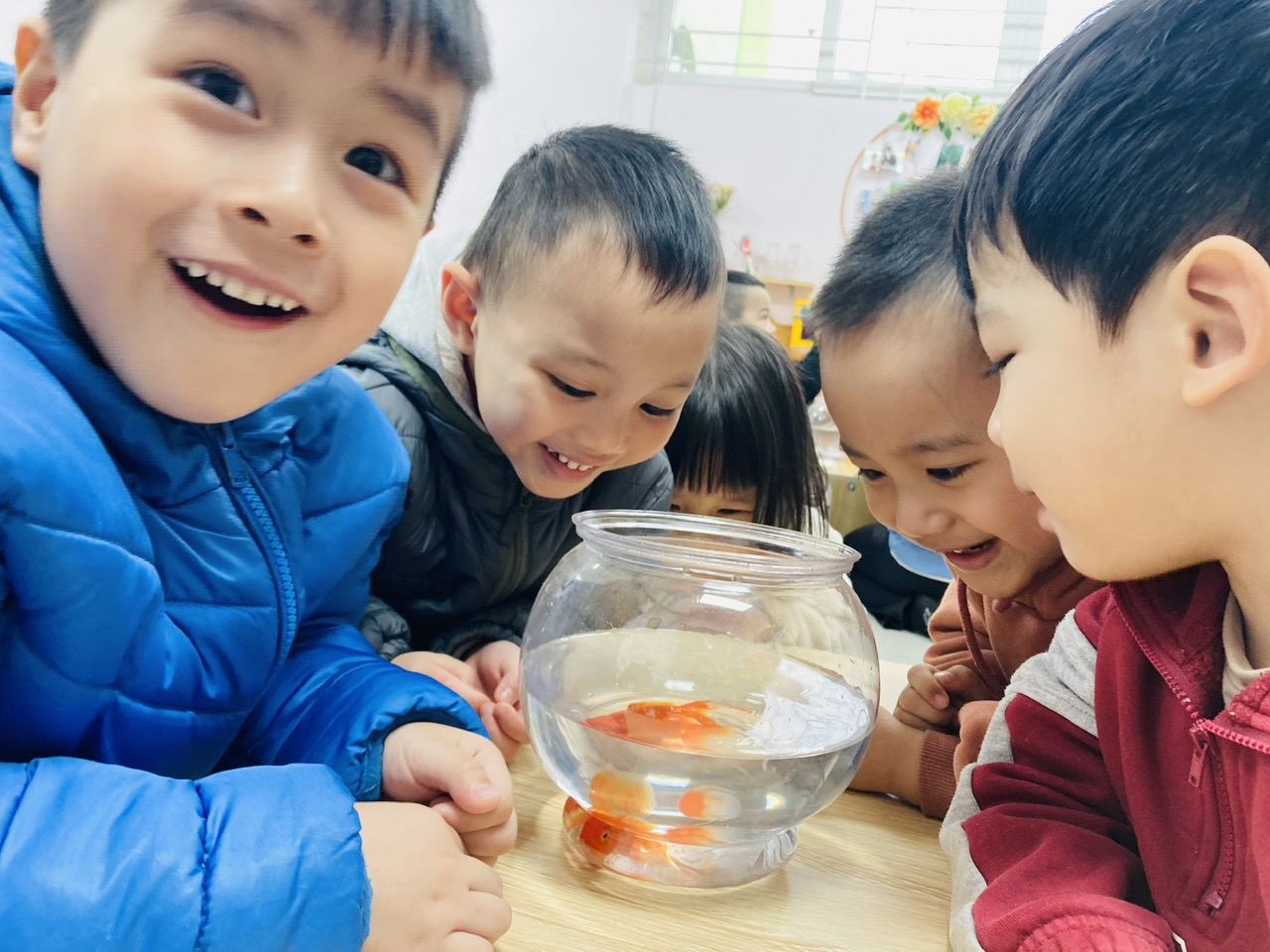 Lần đầu tiên được nhìn ngắm một chú cá vàng thật gần, các bé thích thú reo lên khi thấy vây cá khẽ rung rinh trong nước, đôi mắt long lanh ngơ ngác như đang trò chuyện. Các bé đã học được rằng cá không thở như con người, rằng chúng cần nước sạch để sống khỏe, và nếu muốn nuôi cá, chúng ta phải chăm sóc chúng thật cẩn thận.
