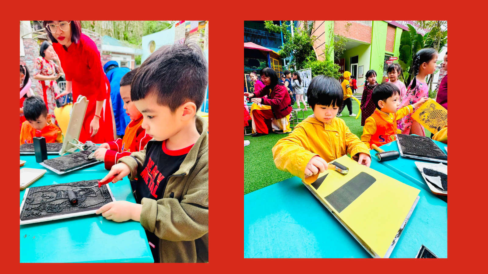 Không chỉ được thưởng thức văn nghệ, các bé còn hào hứng tham gia nhiều trò chơi dân gian truyền thống như: Đi cà kheo, nhảy bao bố, Đồ chữ Thư pháp, Tô Tượng, đồ tranh Đông Hồ, múa sạp… Những trò chơi quen thuộc đã mang lại tiếng cười giòn tan, giúp các con vừa vui chơi vừa hiểu thêm về nét đẹp văn hóa dân gian của dân tộc.