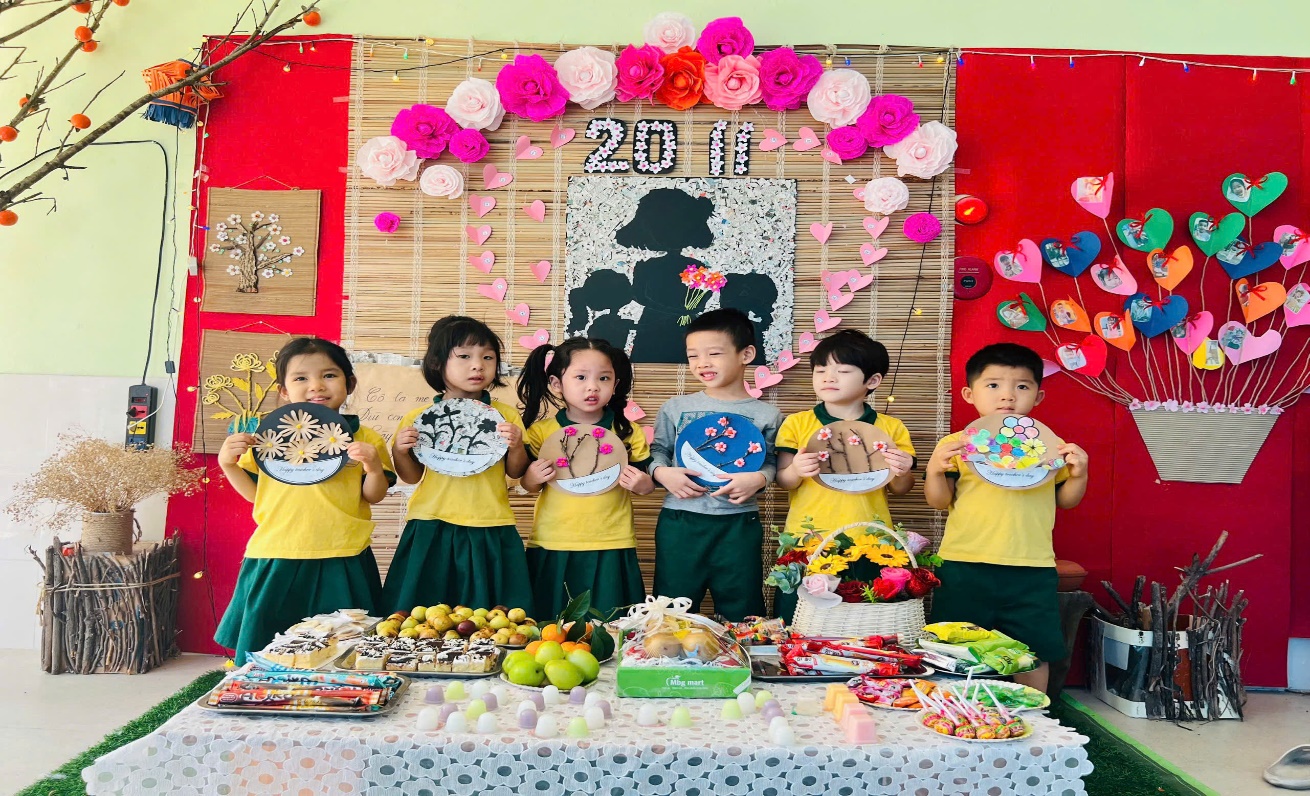 Trong không khí lễ hội, các bé đã gửi tặng những bưu thiếp nhỏ xinh do các bé tự làm nhưng vô cùng ý nghĩa đến các cô giáo, như một lời cảm ơn sâu sắc. Những món quà không chỉ là vật phẩm mà còn là tình cảm, là sự tri ân của các bé đối với những người cô giáo đã luôn dạy bảo, chăm sóc và yêu thương các em.