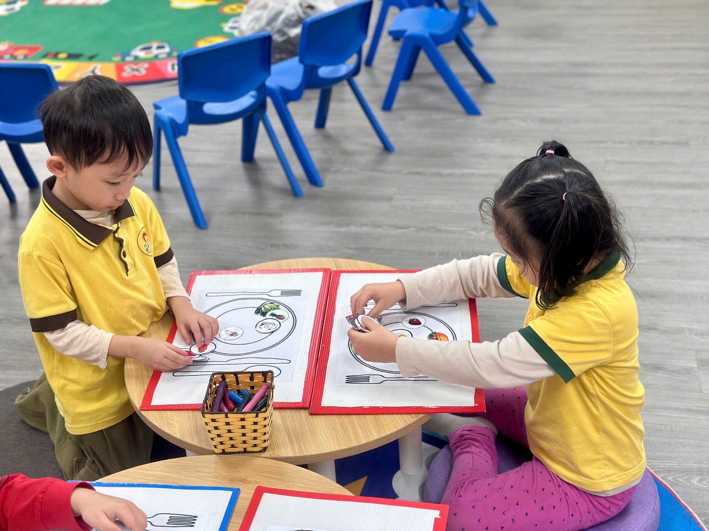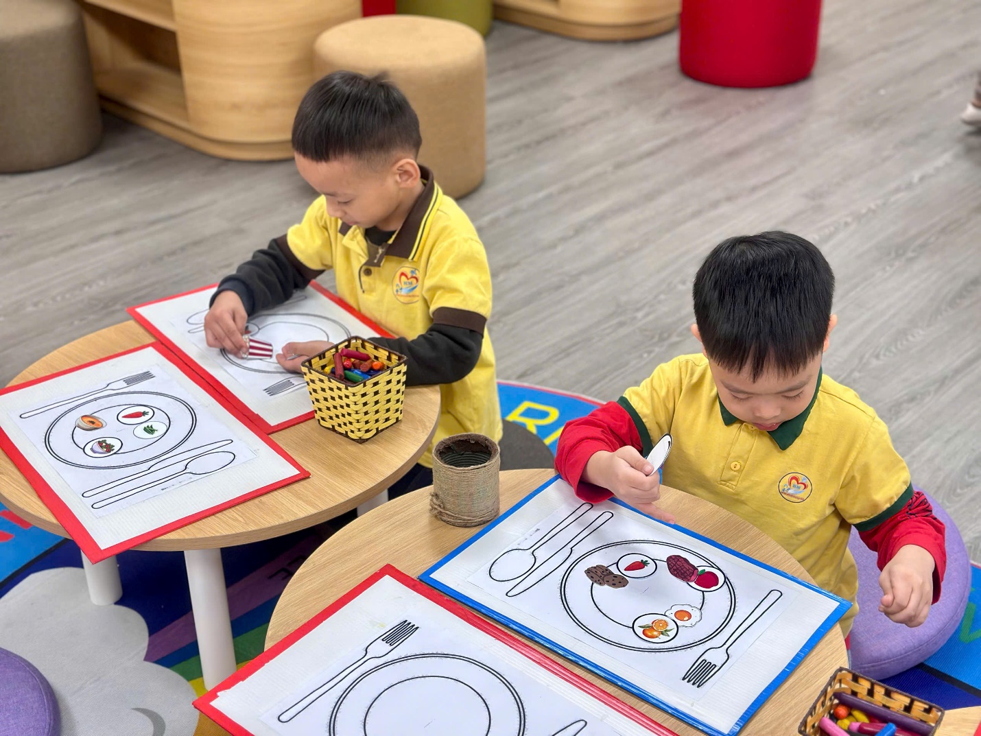 Sau khi quan sát và trò chuyện, các bé được tô màu tháp dinh dưỡng theo hiểu biết của mình.