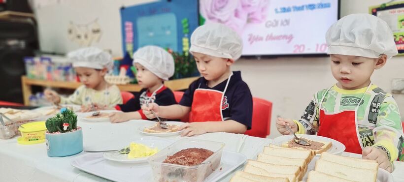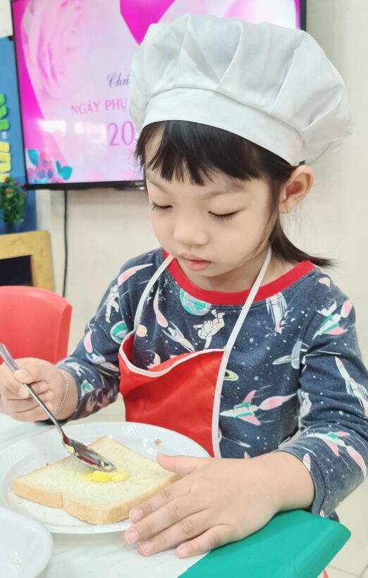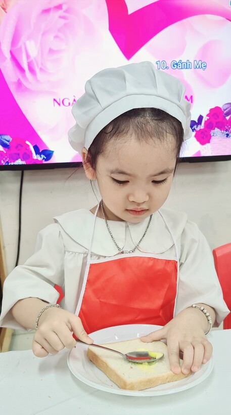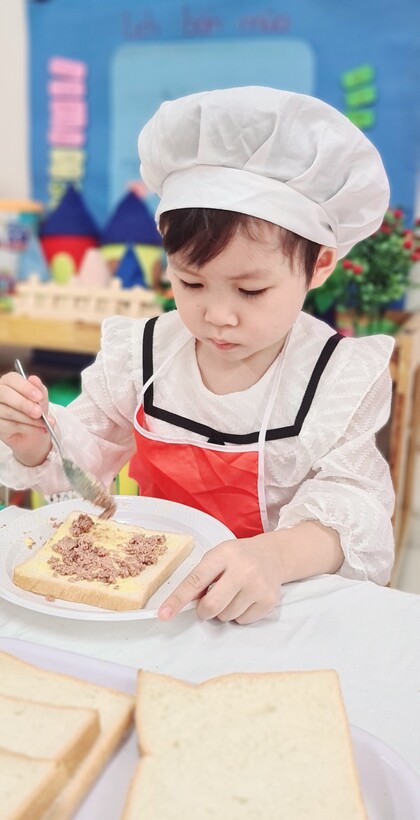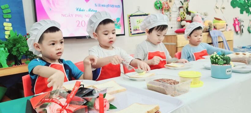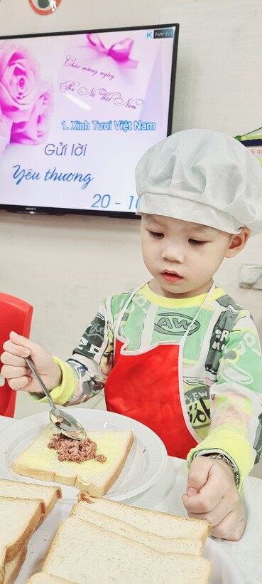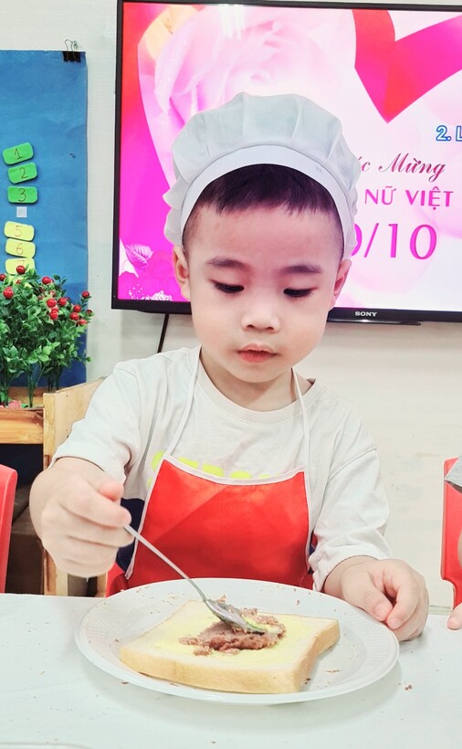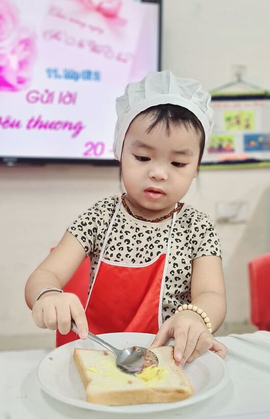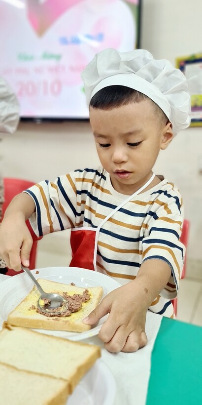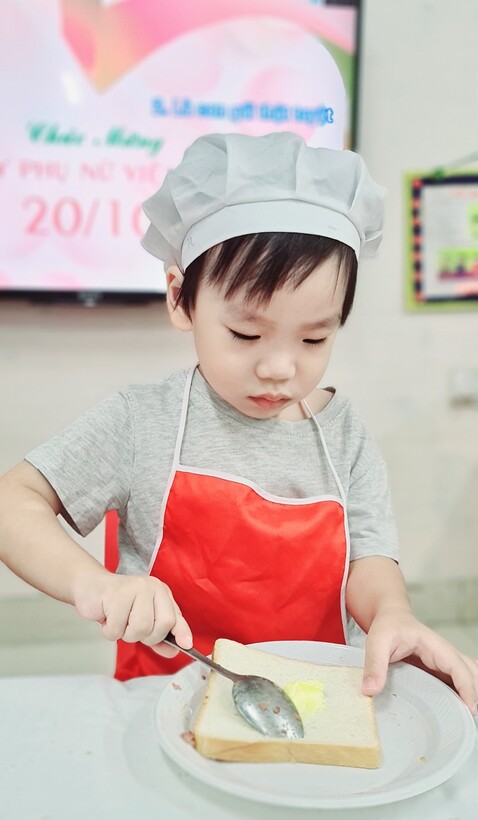 Lên 3 tuổi, các bé đã có thể thực hiện được rất nhiều các kỹ năng, thao tác khéo léo của đôi bàn tay. Để phát triển các vận động tinh cho đôi tay, hàng tháng, hoạt động “Bé tập làm nội trợ” đã được triển khai rộng khắp trong cả khối, nhằm tạo cơ hội cho các con được thực hiện, luyện tập những kỹ năng cần thiết. Nhân ngày Phụ Nữ Việt Nam 20/10, lớp đã tổ chức cho các con làm bánh mỳ kẹp pate để dành tặng mẹ. Qua hoạt động này, các con đã biết phết bơ, pate lên bánh mỳ sao cho thật đều, rồi lấy một lát bánh mỳ nữa đặt lên trên, sau đó cho vào máy nướng bánh. Với một số công đoạn như vậy, các con đã tự tay mình làm được một món ăn đơn giản để tặng mẹ và những người thân xung quanh. Những chiếc bánh thơm ngon đã gói trọn tình yêu thương cũng như lời cảm ơn của các con dành cho mẹ của mình. Mời các bạn cùng xem một số hình ảnh trong buổi làm bánh này nhé