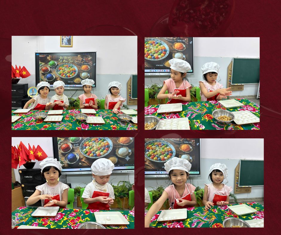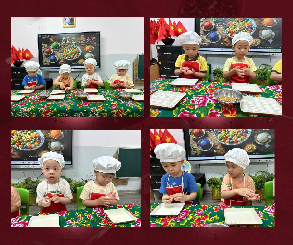 Dưới sự hướng dẫn nhẹ nhàng, tận tình của các cô giáo, các bé đã được ôn lại những kỹ năng tạo hình quen thuộc. Từ việc ấn dẹt bột, đặt viên đường nhỏ xinh vào giữa, rồi khéo léo xoay tròn, đôi bàn tay bé xíu dần tạo nên những viên bánh trôi trắng ngần, tròn trịa.