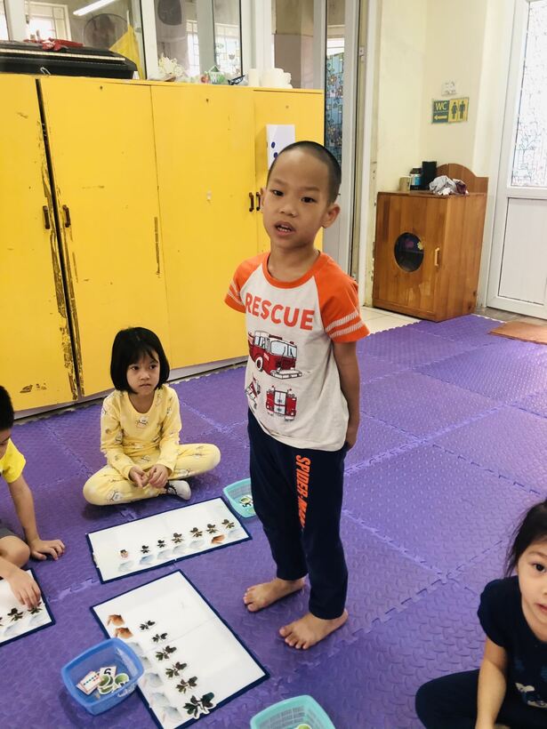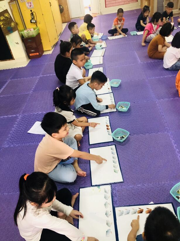 Đặc điểm nhận thức của trẻ 5-6 tuổi là nhận thức bằng cảm tính, tư duy trực quan hình tượng là chủ yếu, vì vậy trẻ nhận biết các biểu tượng sơ đẳng về toán thông qua hoạt động và nhờ vào sự tham gia của các giác quan: Mắt nhìn, tai nghe, tay cầm, nắm để nhận xét, giải thích. Thông qua hoạt động làm quen với toán: " Nhận biết số lượng trong phạm vi 7, đếm đến 7 và nhận biết số 7" các giác quan của trẻ được huy động để nhận biết, so sánh, phân biệt các nhóm đối tượng khác nhau từ đó tìm ra nhóm đối tượng theo yêu cầu của cô. Khi thao tác với các tập hợp đa dạng, trẻ học được cách thiết lập mối liên hệ số lượng giữa các nhóm đối tượng, học cách phản ánh các mối liên hệ đó bằng các từ: Nhiều hơn, ít hơn, bằng nhau, số đứng trước, số đứng sau. Sự hình thành những biểu tượng về các nhóm đối tượng ở trẻ cùng với việc trẻ nắm 1 số kỹ năng so sánh các nhóm đối tượng là cơ sở để trẻ lĩnh hội những mối quan hệ số lượng, trẻ hiểu con số và nắm được quy luật của dãy số tự nhiên. Sau đây là một số hình ảnh trong giờ hoạt động làm quen với toán của các bé lớp A2 đấy: