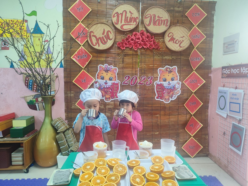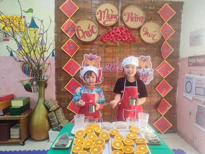 Để tăng cường sức đề kháng trong mùa dịch và giải nhiệt cho cơ thể, ngày hôm nay các bạn nhỏ lớp B2 đã được các cô hướng dẫn cách pha nước cam. Từ những kỹ năng đơn giản đến phức tạp cô đã hướng dẫn con và con hoàn thành thật tốt. Đôi bàn tay nhỏ xinh xoay xoay trái cam vắt lấy nước, bỏ đường và điều chỉnh độ chua ngọt phù hợp theo ý thích của mình. Việc con “tự phục vụ” không những tạo cho con niềm vui, giúp con ngon miệng hơn mà còn tập cho con những kĩ năng cần thiết trong cuộc sống.