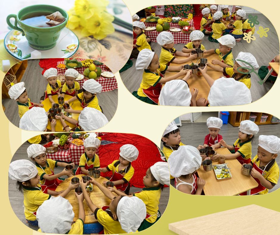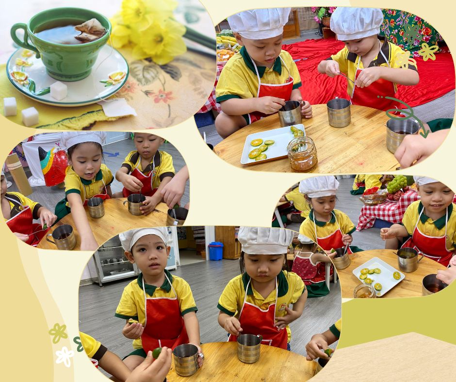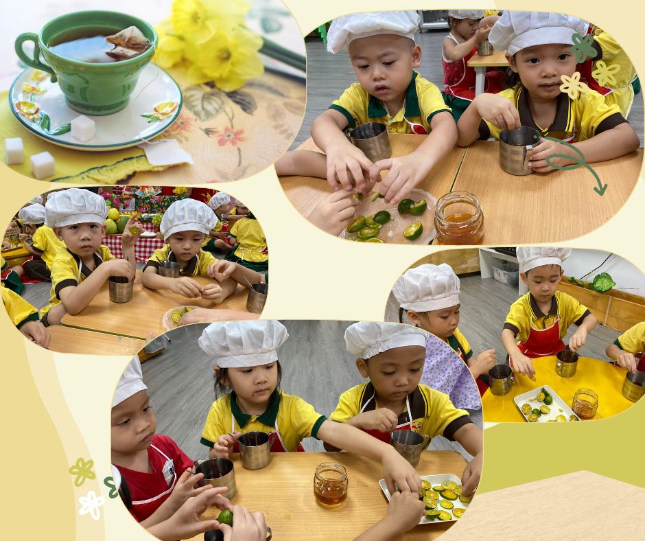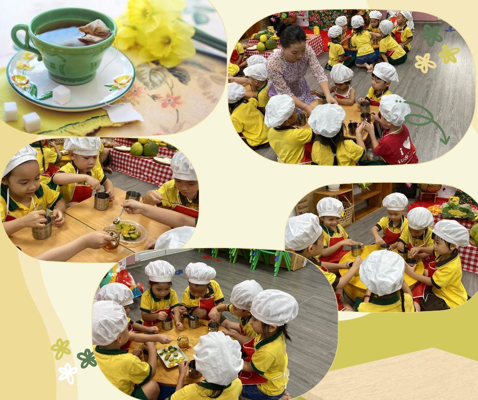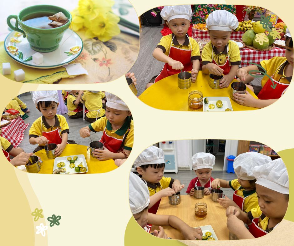 👕 Với đồng phục gọn gàng và những chiếc tạp dề nhỏ xinh, các bạn nhỏ đã tự tay chuẩn bị món trà quất mật ong – một loại trà dân dã, thanh mát và tốt cho sức khỏe. Dưới sự hướng dẫn nhẹ nhàng của các cô, mỗi bé đều hào hứng học cách vắt quất, khuấy mật ong, rót trà và cùng nhau chia sẻ thành quả với bạn bè.