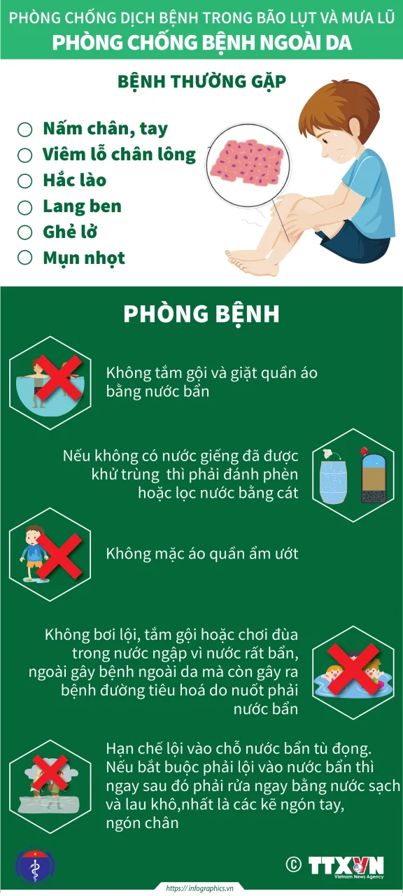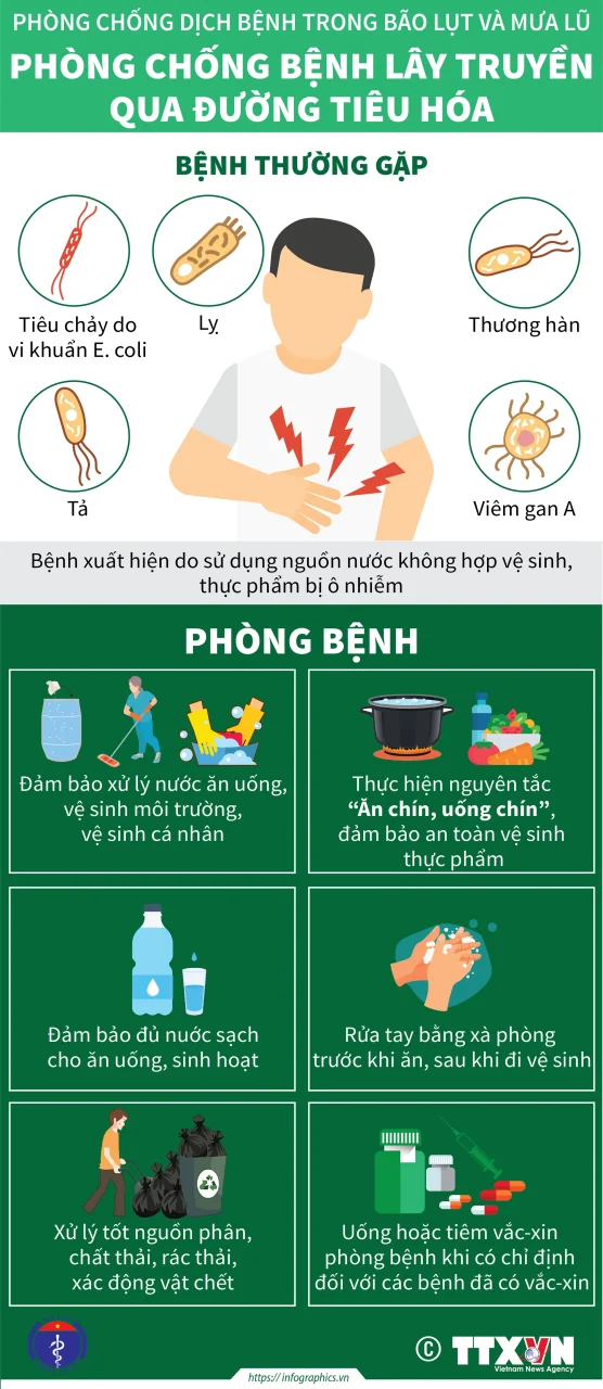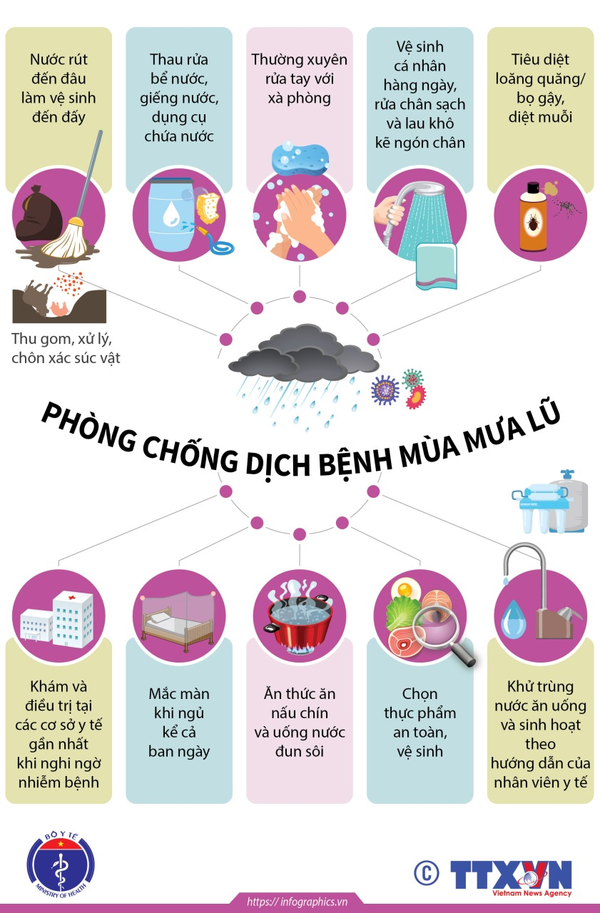 Để chủ động phòng ngừa dịch bệnh trong và sau lũ lụt do nguồn nước bị ô nhiễm, điều kiện vệ sinh không đảm bảo tại các khu vực bị lũ lụt, cơ quan chức năng cần đảm bảo trang thiết bị, thuốc men, hóa chất khử trùng nước, đặc biệt là chủ động giám sát, phát hiện sớm dịch bệnh để kịp thời huy động, bố trí lực lượng như đội cơ động phòng chống dịch xử lý kịp thời tại các vùng xảy ra lũ lụt, ngập úng; Cung cấp hóa chất và hướng dẫn cho từng hộ gia đình ở những vùng trọng điểm để xử lý môi trường và nguồn nước.