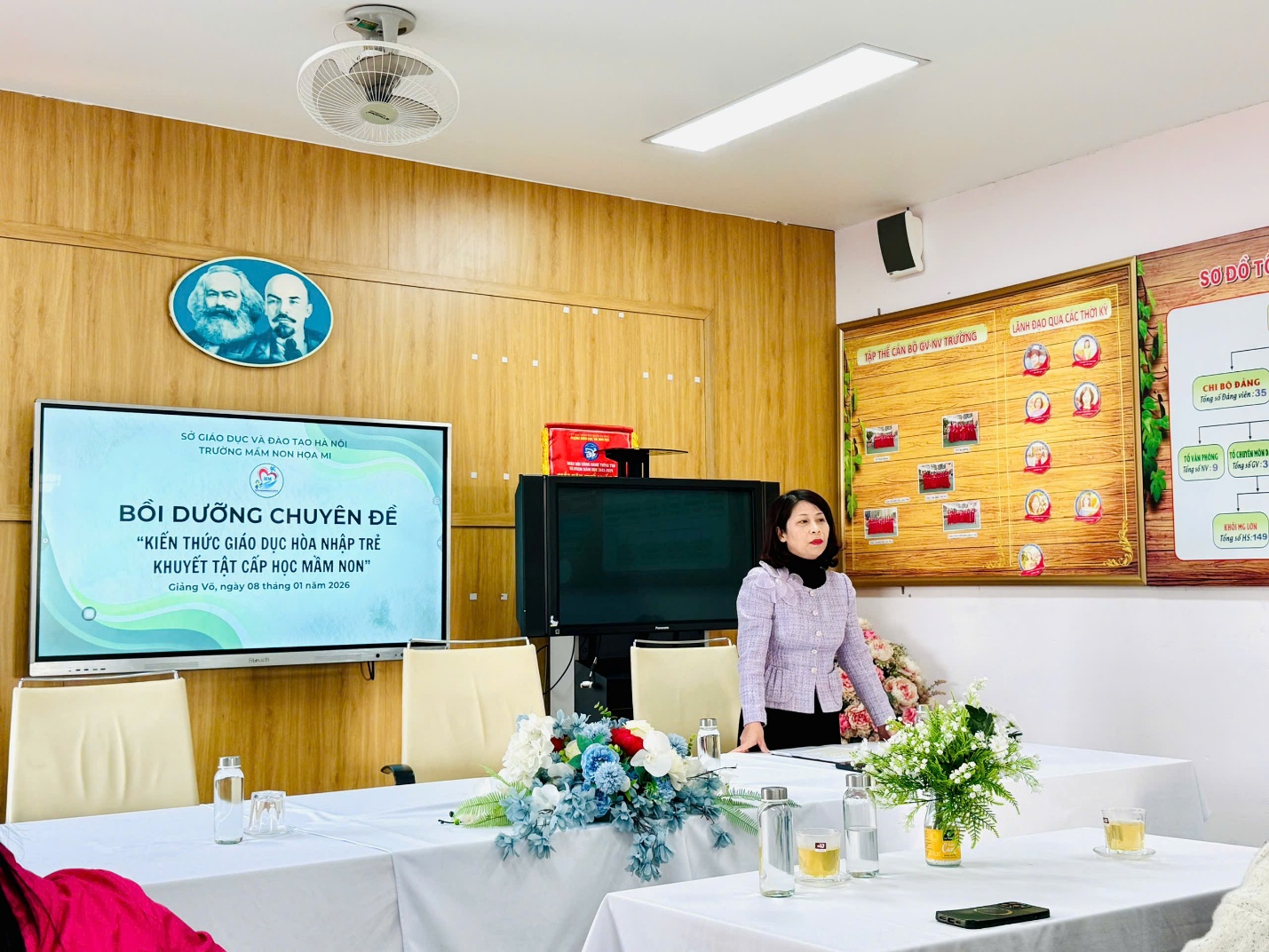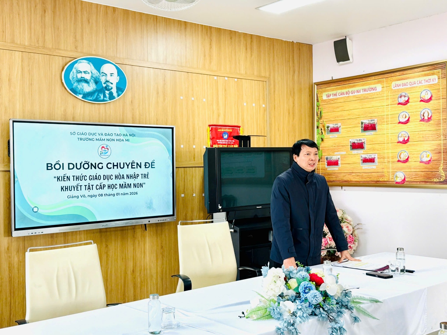 Sáng thứ năm ngày 08/01/2026 được sự phân công của Sở Giáo dục và Đào tạo, phối hợp với Phòng Văn hóa – Xã hội phường Giảng Võ, Trường Mầm non Họa Mi tổ chức buổi tập huấn chuyên đề “Bồi dưỡng kiến thức giáo dục hòa nhập trẻ khuyết tật cấp học mầm non”, nhằm chia sẻ lại những nội dung đã được tập huấn tới các trường mầm non trên địa bàn phường Giảng Võ.